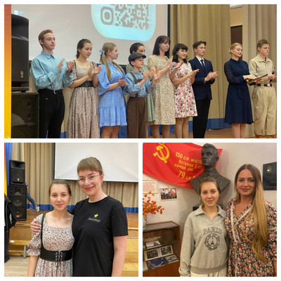 Зайцева Маргарита, солистка народного ансамбля эстрадной песни «Тоника» (педагог Гужель В.А.) МБОДО «ДДЮТ «Юность», 15 и 16 октября приняла участие в финале патриотического творческого марафона «Время Победы», который проходил в школах Москвы. Патриотический творческий марафон фестиваль–конкурс «Время Победы» посвящён подвигу советского народа в Великой Отечественной войне и Дню Победы. Конкурс проводился по трем номинациям: вокальное искусство, хореографическое искусство и театральное искусство. На конкурс принимались номера, посвященные подвигу советского народа в Великой Отечественной войне, событиям Великой Отечественной войны, Победе в Великой Отечественной войне. Вместе с другими ребятами из Донецкой и Луганской Народных Республик Маргарита выступила перед московскими школьниками и ветеранами Великой Отечественной войны и приняла участие в проекте «Поэтория».