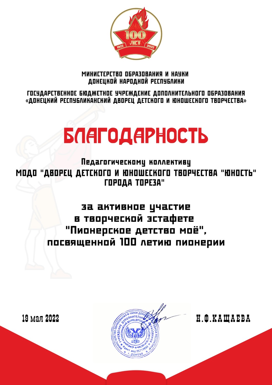 Пионерия – это не только культурный пласт и наследие эпохи, это и огромный педагогический опыт, грамотно выстроенная система воспитания и занятости детей и подростков. МОДО «ДДЮТ «Юность» г. Тореза» в честь 100-летнего юбилея пионерии присоединяется к эстафете «Пионерское детство мое», проводимой ГБДОУ «ДонРДДЮТ».