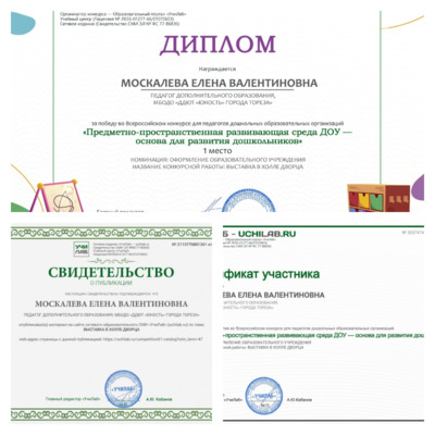 Педагог Дворца творчества Москалева Е.В. стала победителем во Всероссийском конкурсе для педагогов дошкольных образовательных организаций «Предметно-пространственная развивающая среда ДОУ – основа для развития дошкольников» (номинация «Оформление образовательного учреждения»). Конкурс проходил на платформе «Училаб». Педагог получила свидетельство о публикации и сертификат участника конкурса. Поздравляем! | |