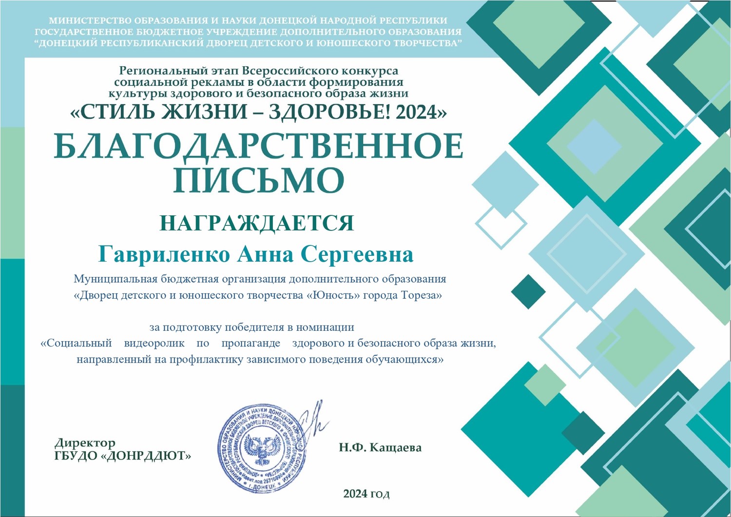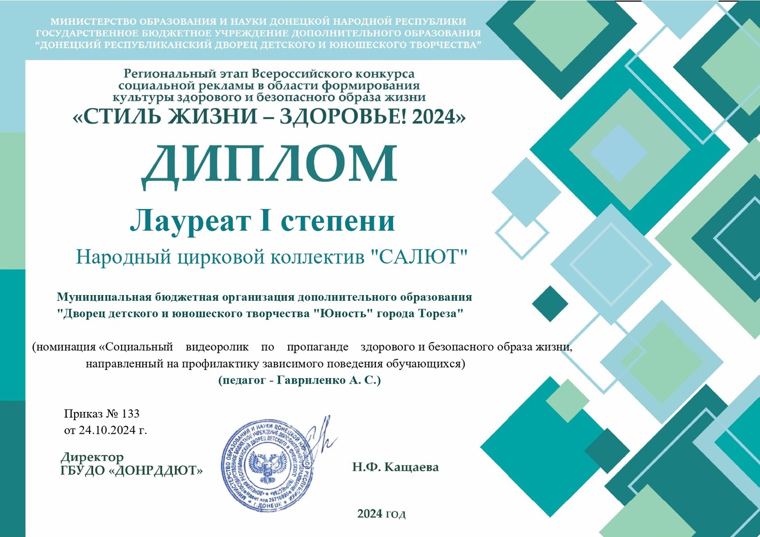 Обучающиеся народного циркового коллектива «Салют» (педагоги Анна и Александр Гавриленко) стали победителями Регионального этапа Всероссийского конкурса социальной рекламы в области формирования культуры здорового и безопасного образа жизни "СТИЛЬ ЖИЗНИ - ЗДОРОВЬЕ!2024" в номинации «Социальный видеоролик по пропаганде здорового и безопасного образа жизни, направленный на профилактику зависимого поведения обучающихся». Педагог награждена благодарственным письмом. Народный ансамбль современного танца "Баттерфляй" (педагог Степанова Ю.Э.) получил сертификат за участие. Поздравляем! Так держать!