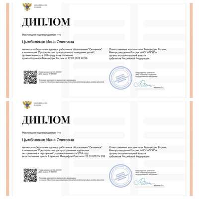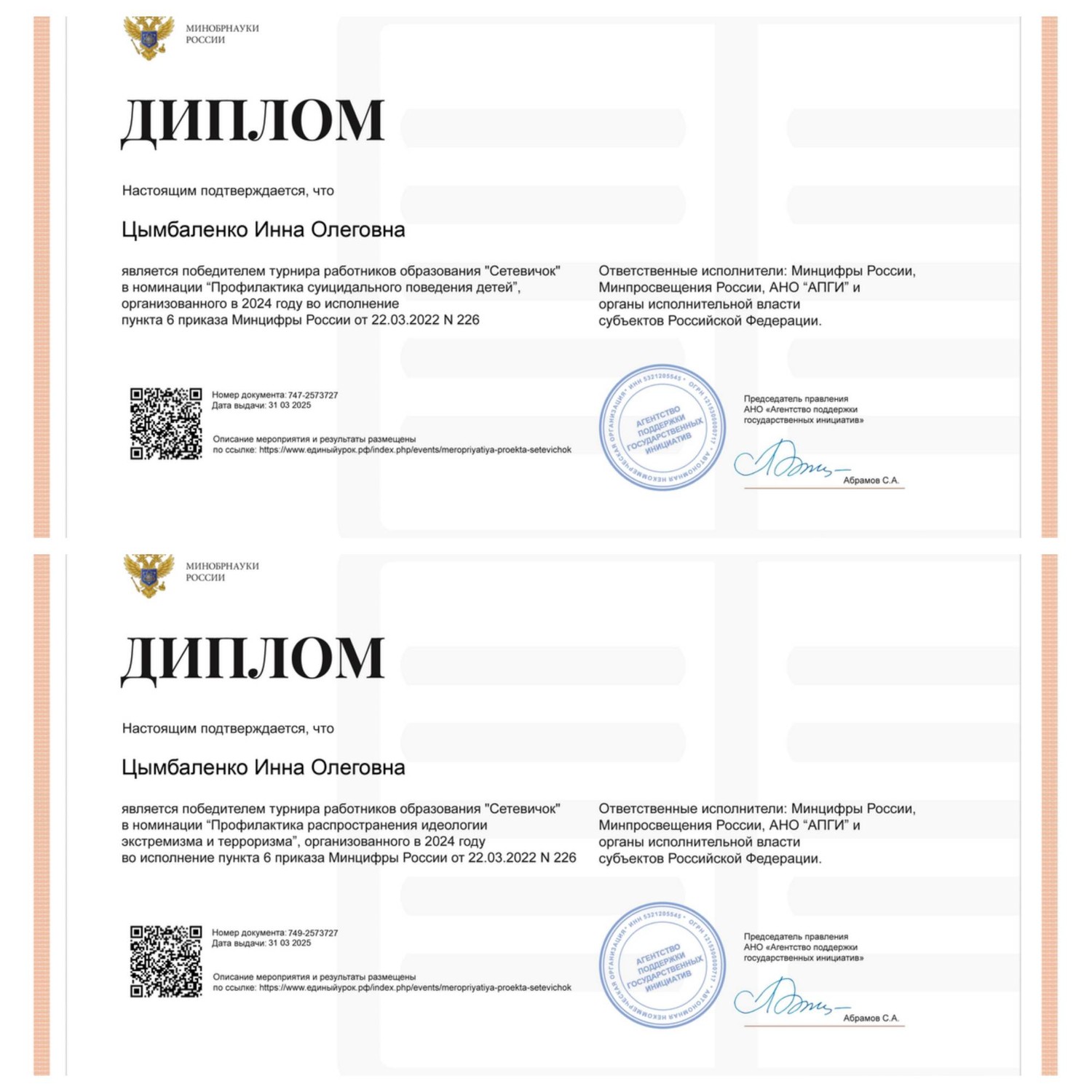 Педагоги Дворца творчества Некипелова И.А. и Цымбаленко И.О. стали победителями турнира работников образования «Сетевичок» (платформа «Единый урок) в номинации «Профилактика суицидального поведения детей» и «Профилактика распространения идеологии экстремизма и терроризма». | |