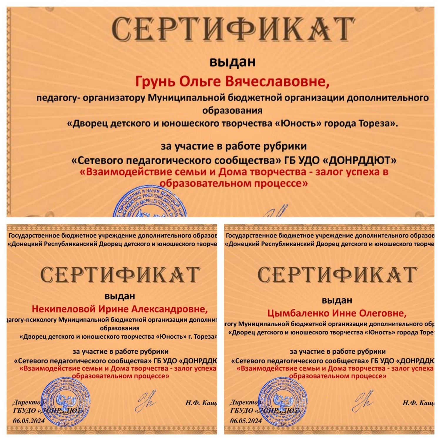 Подведены итоги работы рубрики «Сетевого педагогического сообщества» «ГБ УДО ДОНРДДЮТ» «Взаимодействие семьи и учреждений дополнительного образования - залог успешной работы с детьми». Сертификатами награждены педагоги МБОДО «ДДЮТ «Юность»: Грунь О.В., Некипелова И.А. и Цымбаленко И.О. | |