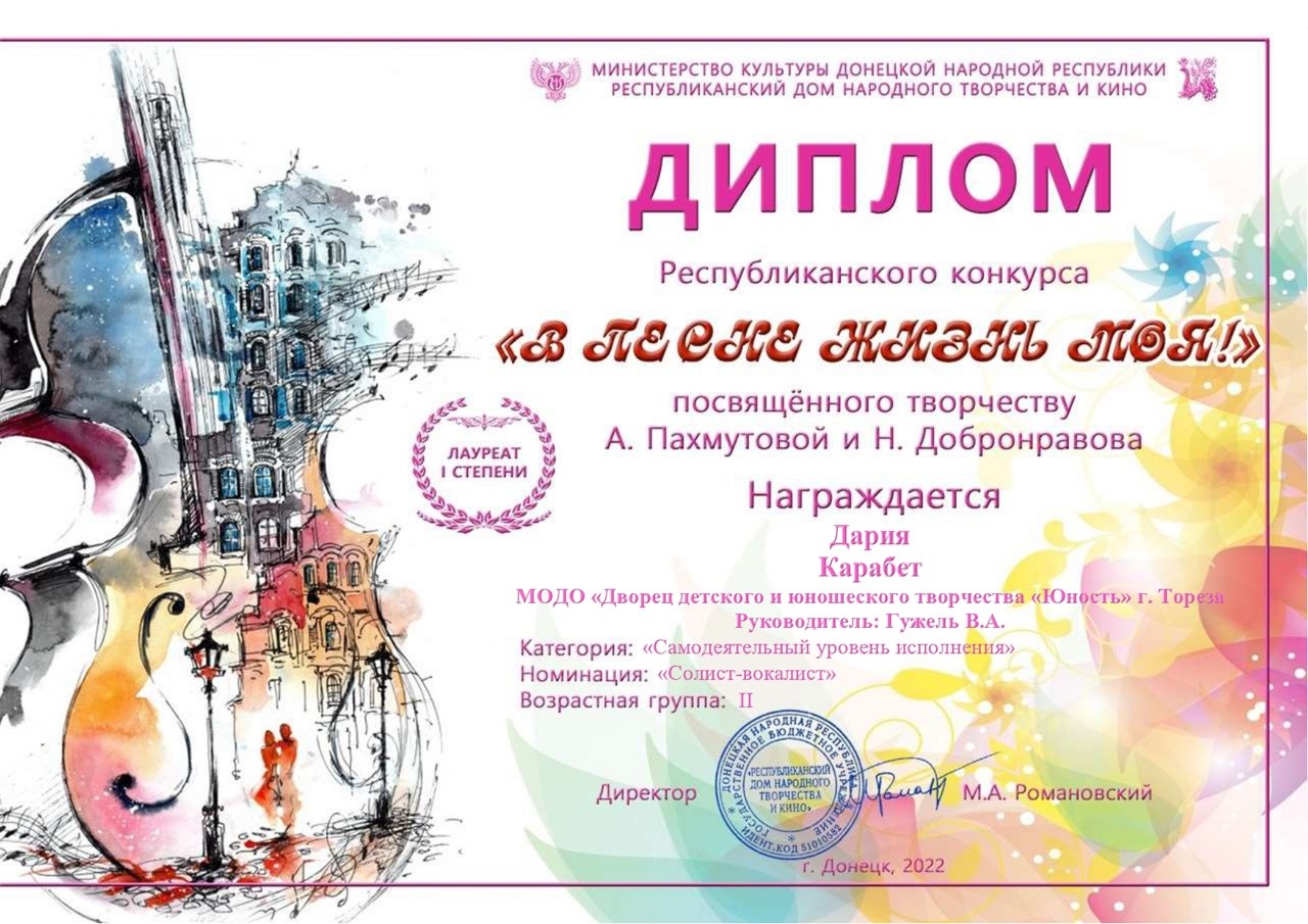 Согласно решению жюри конкурса в категории «Самодеятельный уровень исполнения» в номинации «солист-вокалист» (2 возрастная категория (20-25 лет) I место заняла Дария Карабет, солистка народного ансамбля эстрадной песни «Тоника» (педагог Гужель В.А.).