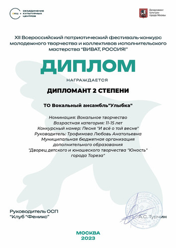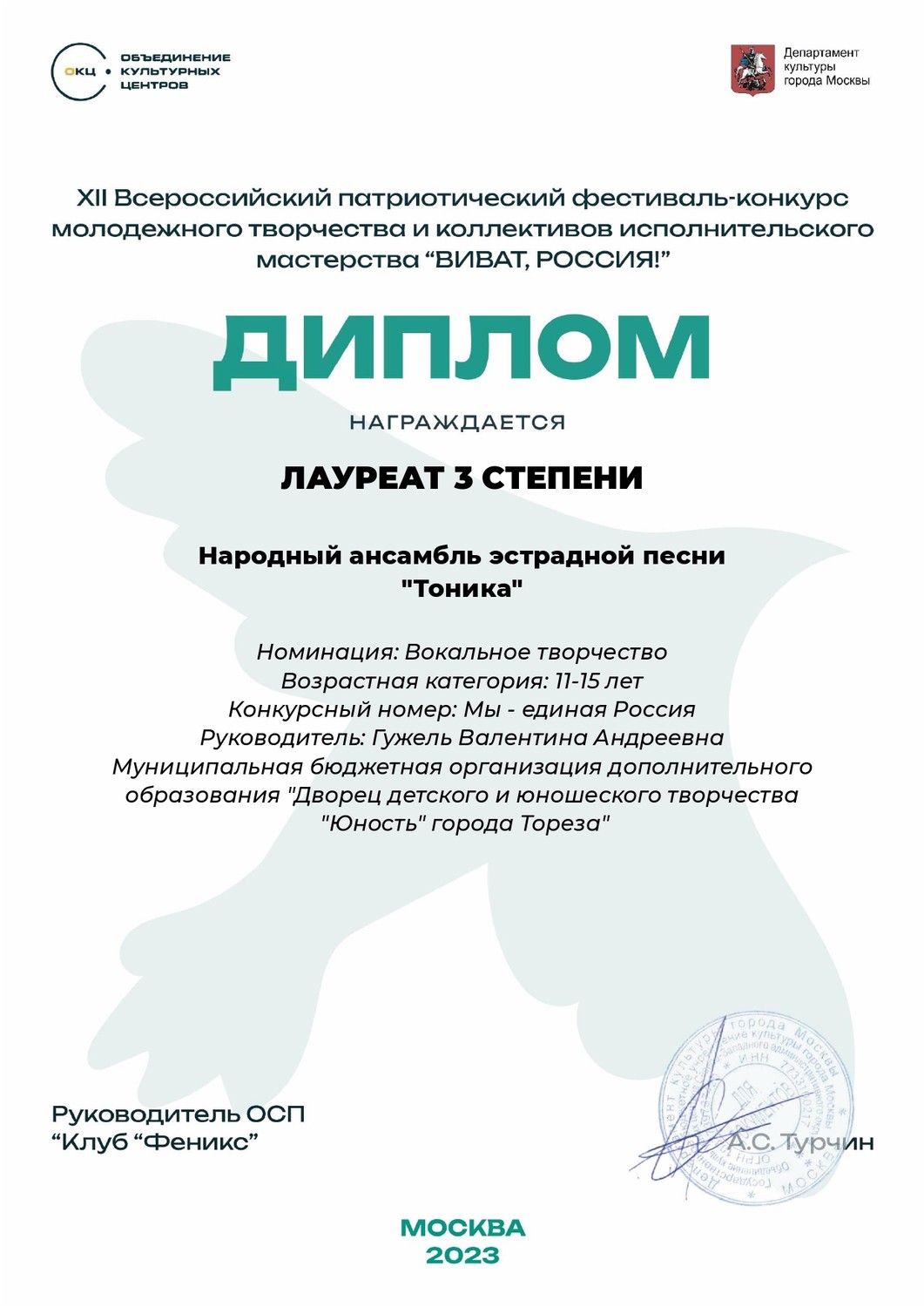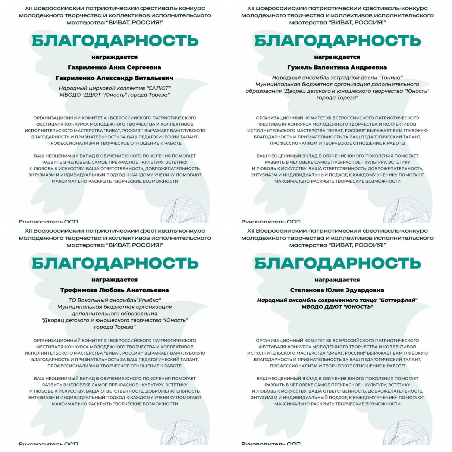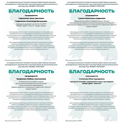 Подведены итоги XII Всероссийского патриотического фестиваля-конкурса молодёжного творчества и коллективов исполнительского мастерства «Виват, Россия!» (г. Москва), в котором приняли участие творческие коллективы МБОДО «ДДЮТ «Юность». Фестиваль-конкурс проводится ежегодно для выявления и поддержки одарённых, талантливых коллективов в различных жанрах искусства и создание дополнительных условий для развития и популяризации творчества патриотической тематики среди молодёжи России. Итоги конкурса: Лауреат 1-ой степени – «Возвращайся домой» (ТО «Баттерфляй», педагог Степанова Ю.Э.); Лауреат 3-ей степени – «Мы-единая Россия» (ТО «Тоника», педагог Гужель В.А.); Дипломант 2-ой степени – «И всё о той весне» (ТО «Улыбка», педагог Трофимова Л.А.); Дипломанты 3-ей степени – Гавриленко Дарья и Диденко Алиса (ТО «Салют», педагоги Анна и Александр Гавриленко). Педагоги награждены благодарственными письмами. Поздравляем! | |