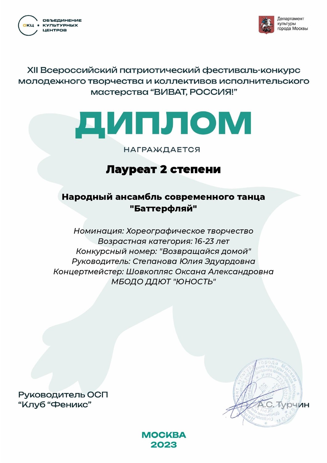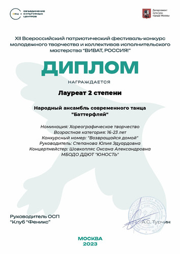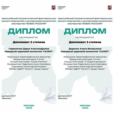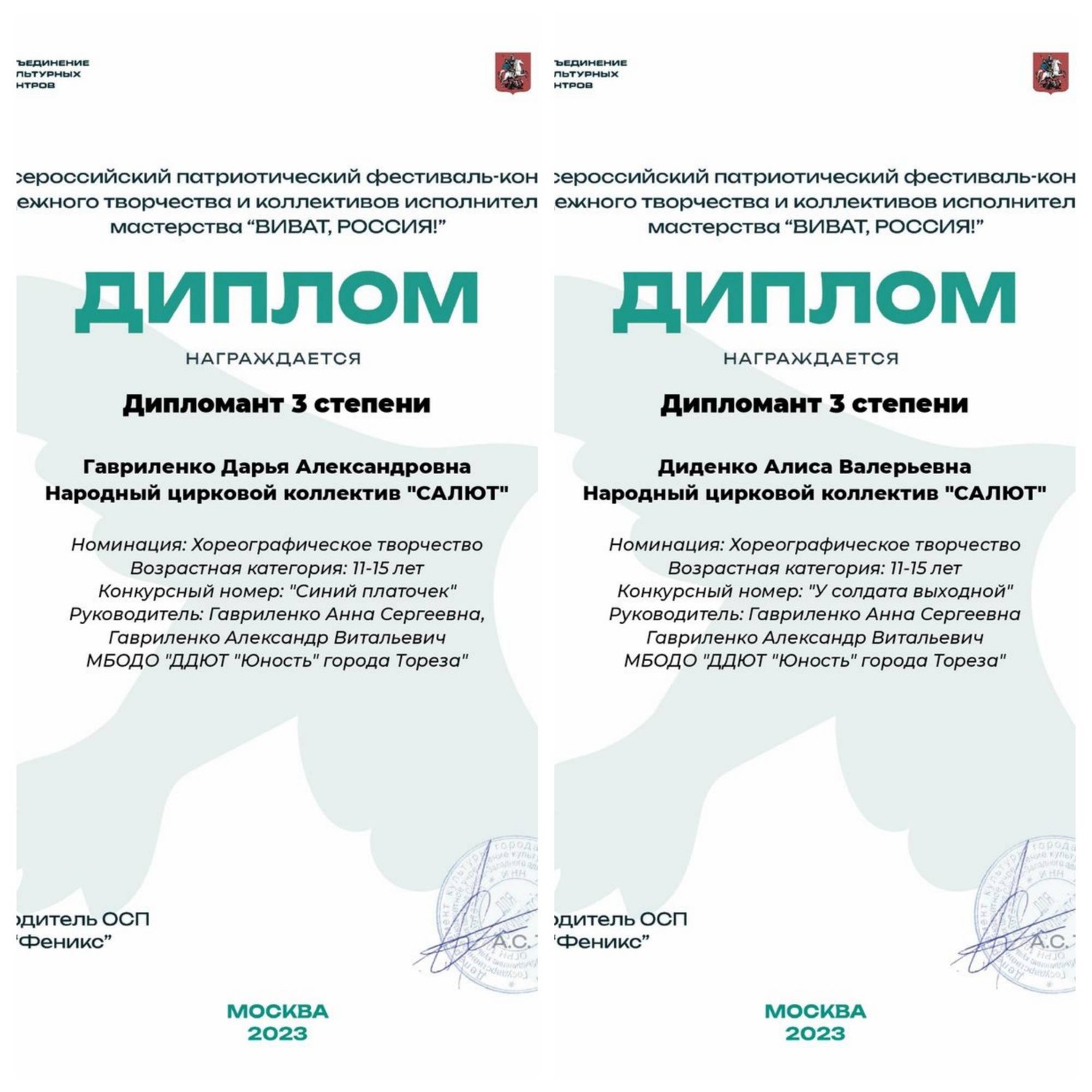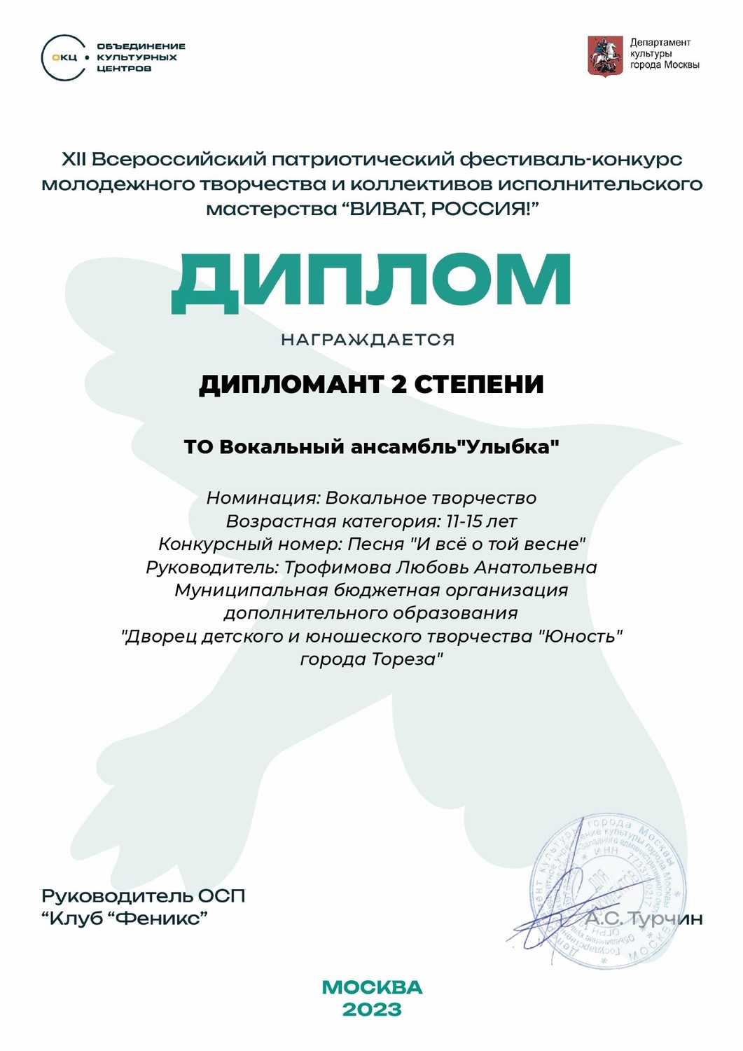 Подведены итоги XII Всероссийского патриотического фестиваля-конкурса молодёжного творчества и коллективов исполнительского мастерства «Виват, Россия!» (г. Москва), в котором приняли участие творческие коллективы МБОДО «ДДЮТ «Юность». Фестиваль-конкурс проводится ежегодно для выявления и поддержки одарённых, талантливых коллективов в различных жанрах искусства и создание дополнительных условий для развития и популяризации творчества патриотической тематики среди молодёжи России. Итоги конкурса: Лауреат 1-ой степени – «Возвращайся домой» (ТО «Баттерфляй», педагог Степанова Ю.Э.); Лауреат 3-ей степени – «Мы-единая Россия» (ТО «Тоника», педагог Гужель В.А.); Дипломант 2-ой степени – «И всё о той весне» (ТО «Улыбка», педагог Трофимова Л.А.); Дипломанты 3-ей степени – Гавриленко Дарья и Диденко Алиса (ТО «Салют», педагоги Анна и Александр Гавриленко). Педагоги награждены благодарственными письмами. Поздравляем! | |