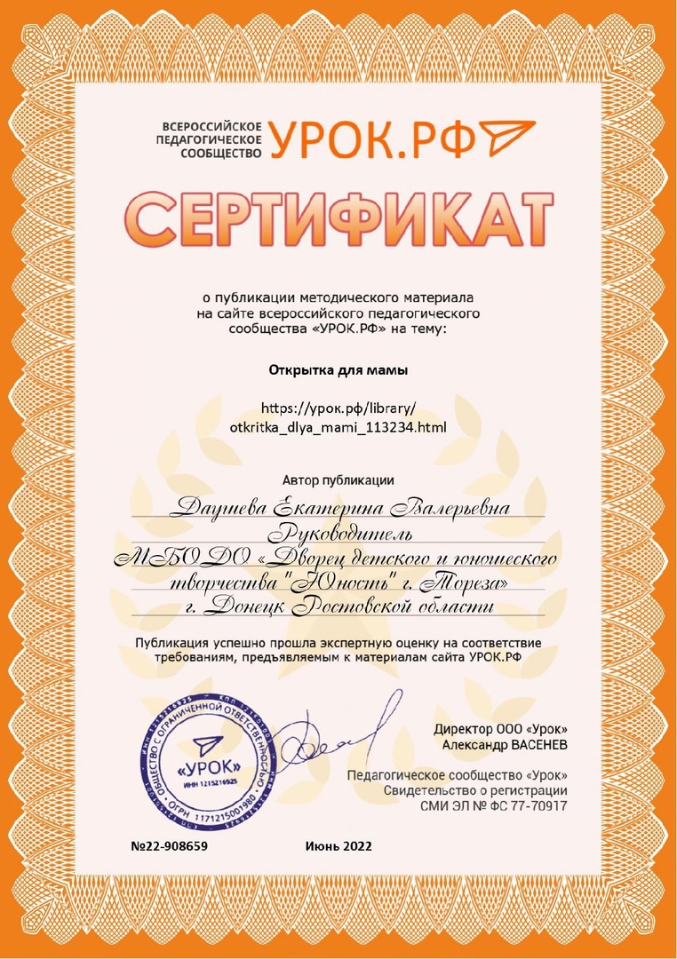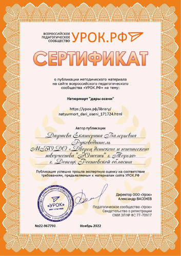 Педагог Даушева Е.В. получила 2 сертификата за публикацию методических материалов «Открытка для мамы» и натюрморт «Дары осени» на платформе Урок.РФ. Поздравляем! | |