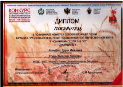 15 апреля 2025 года в городе Ростов-на-Дону состоялся полуфинал Конкурса детской казачьей песни, который в этом году проходит в юбилейном формате в рамках празднования 80-летия Победы в Великой Отечественной войне. Организатором Конкурса является Федеральное государственное бюджетное образовательное учреждение высшего образования «Всероссийский государственный университет юстиции (РПА Минюста России)» при поддержке Министерства юстиции Российской Федерации и Следственного комитета Российской Федерации. Дарья Ярошенко, солистка народного ансамбля эстрадной песни «Тоника» (педагог Гужель В.А.) стала полуфиналисткой конкурса! Участники поразили жюри не только вокальным мастерством, но и глубоким пониманием казачьих традиций. В церемонии награждения победителей, лауреатов и дипломантов приняли участие первый проректор Всероссийского государственного университета юстиции Дмитрий Владимирович Гурьев, а также представители Следственного комитета РФ. Лучшие исполнители полуфинала получили путевку в финал, который пройдет в Москве 3 и 4 мая, где определятся главные победители. Мы поздравляем Дашу с достойным выступлением на конкурсе и желаем победы в финале! | |
