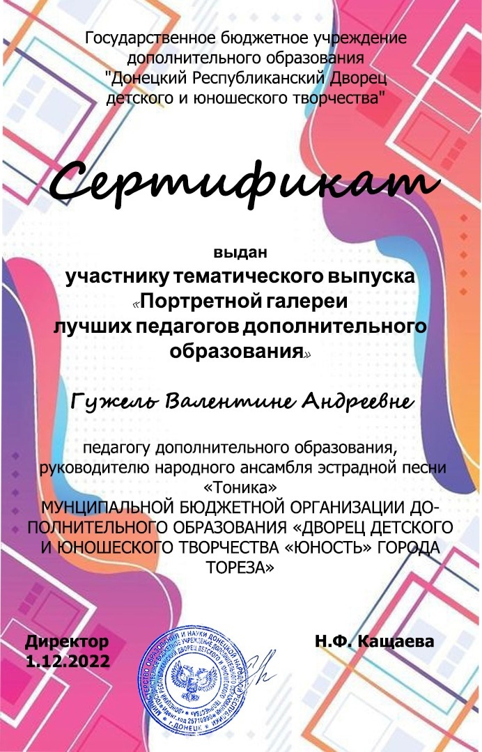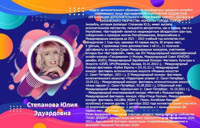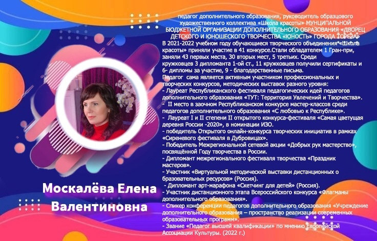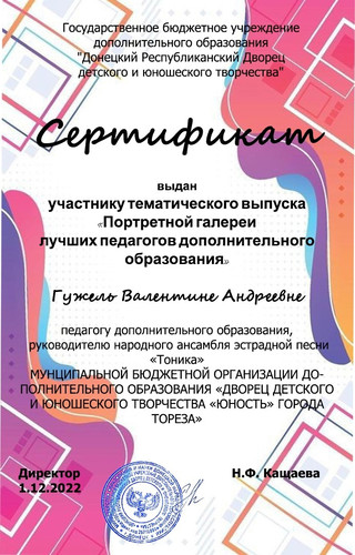 Педагоги МБОДО «ДДЮТ «Юность» Гужель В.А., Степанова Ю.Э. и Москалева Е.В. приняли участие в тематическом выпуске «Портретной галерее лучших педагогов дополнительного образования» от ГБУДО «ДонРДЮТ». ГУЖЕЛЬ ВАЛЕНТИНА АНДРЕЕВНА, педагог дополнительного образования, руководитель народного ансамбля эстрадной песни «Тоника» Валентина Андреевна - опытный специалист, имеющий высокий уровень профессионализма, инициативы, творчества, в совершенстве владеет эффективными формами организации обучения и воспитания. Народный ансамбль эстрадной песни «Тоника», которым руководит педагог, неоднократный победитель и призер Республиканских, Всероссийских и Международных конкурсов и фестивалей: Национальная премия «Будущее России», «Надежды Европы», IIМеждународный конкурс «Гордость страны», Международный конкурс «Жар-птица России», III Международный конкурс «Евразийская волна», Всероссийский конкурс патриотической песни «За Русь единую», Всероссийский конкурс патриотической песни «За тебя, Родина», Отборочный этап Международной премии «Щелкунчик», Международный фестиваль юных талантов «МосГаз зажигает звёзды» и многих других. За период с сентября 2021года по ноябрь 2022 года коллектив принял участие в 24 Международных, 16 Всероссийских конкурсах. Результат успешного выступления: Международные конкурсы – 3 Гран-при, 95 первых, 32 вторых, 14 третьих мест; Всероссийские конкурсы - 4 Гран-при, 6 первых, 13 вторых, 12 третьих мест. В 2021 году Гужель Валентина Андреевна награждена почётной медалью «Педагог года 2020-2021» по версии Национальной Премии в области культуры и искусства «Будущее России», в 2022 году - знаком и Дипломом XXV Международного конкурса исполнительского мастерства «НАДЕЖДЫ ЕВРОПЫ» за высокий профессионализм и подготовку участников конкурса. За творчество, профессионализм, многолетний труд Валентина Андреевна награждена Грамотой Главы Донецкой Народной Республики, Грамотой Министерства образования и науки Донецкой Народной Республики, Грамотой администрации города Тореза, Благодарностью администрации города Тореза. МОСКАЛЕВА ЕЛЕНА ВАЛЕНТИНОВНА, педагог дополнительного образования, руководитель образцового художественного коллектива «Школа красоты» Елена Валентиновна - талантливый педагог, мастер своего дела, полная творческих сил и интересных идей, никогда не останавливается на достигнутом. Её отличает ответственное отношение к своим обязанностям, стремление к проявлению методического мастерства в педагогической деятельности, умение осуществлять творческий подход к решению разнообразных педагогических задач. В 2021-2022 учебном году обучающиеся творческого объединения «Школа красоты» приняли участие в 41 конкурсе, а именно: 11 Международных, 15 Всероссийских, 12 Республиканских, 3 муниципальных. Стали обладателем 1 Гран-при, заняли 43 первых места, 30 вторых мест, 5 третьих. Среди кружковцев 3 дипломанта 1-ой ст., 11 кружковцев получили сертификаты и 6- дипломы за участие, 9 - благодарственные письма. Педагог сама является активным участником профессиональных и творческих конкурсов, методических выставок разного уровня: - Лауреат Республиканского фестиваля педагогических идей педагогов дополнительного образования «ТУТ: Территория Увлечений и Творчества». - II место в заочном Республиканском конкурсе мастер-классов среди п