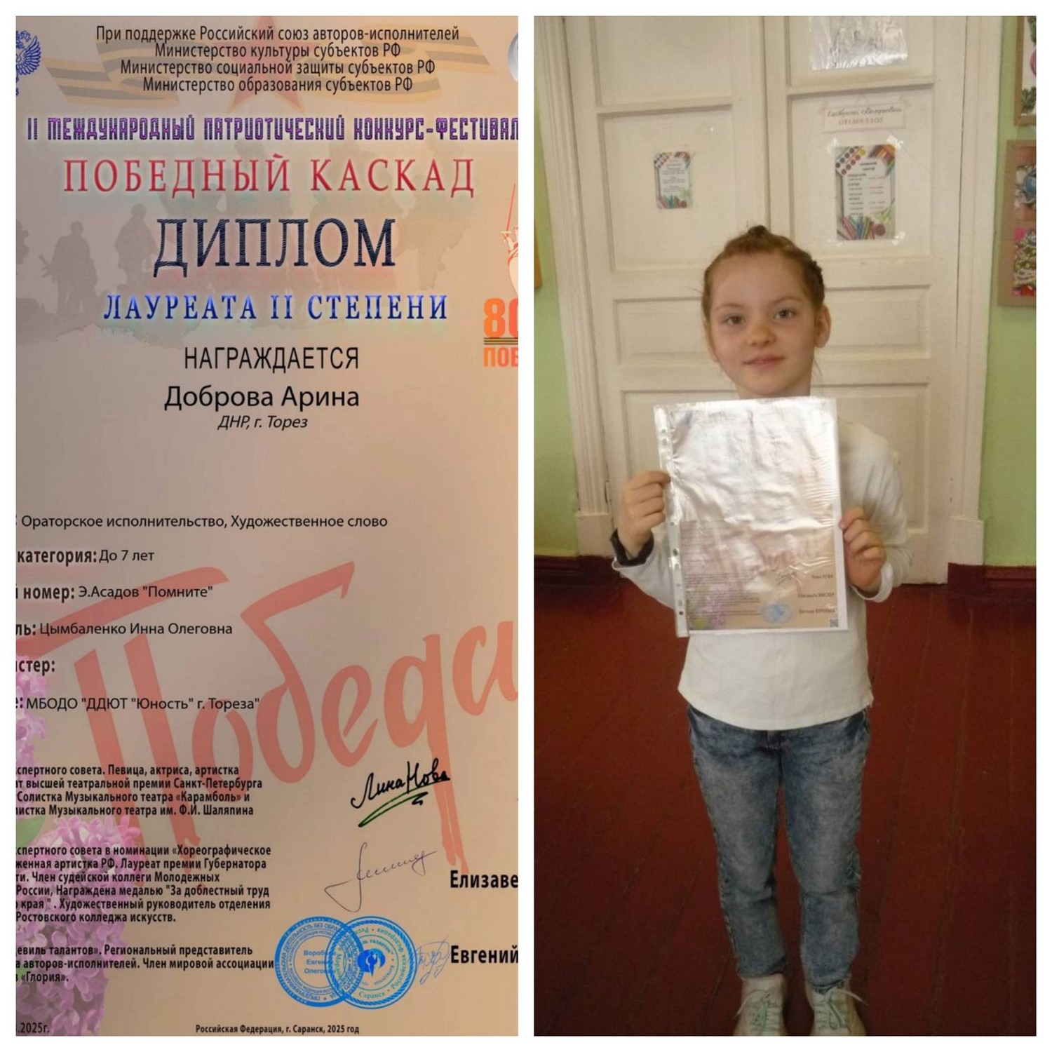 Поздравляем Доброву Арину, воспитанницу школы раннего развития «Город друзей» с получением диплома лауреата 2-ой степени во II Международном патриотическом конкурсе-фестивале «Победный каскад»! Молодец!
