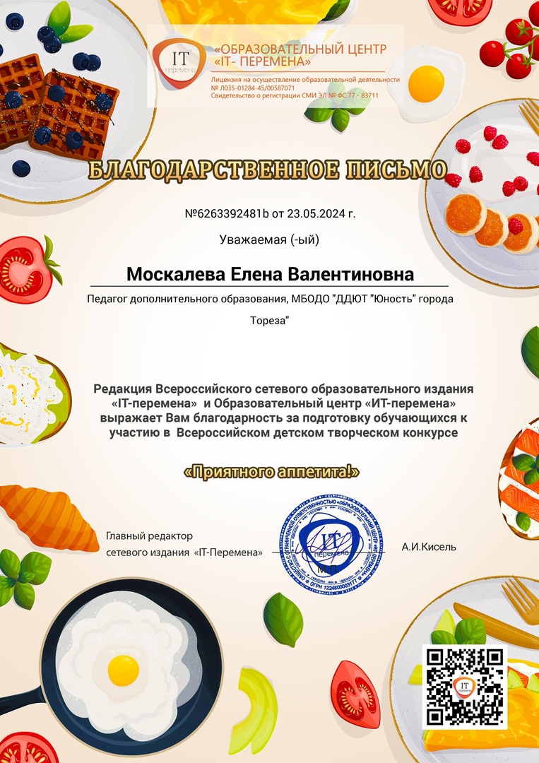 С 16 по 22 мая обучающаяся образцового художественного коллектива «Школа красоты» (педагог Москалева Е.В.) Коршикова Карина приняла участие и стала победителем Всероссийского детского конкурса фотографий «Приятного аппетита!» («ИТ-Перемена», г.Курган). Цель конкурса: предоставление возможности демонстрации творческих способностей в конкурсной форме. Задачи конкурса: • конкурс направлен на стимулирование творческой деятельности; • выявление, сопровождение и поддержку талантливых участников конкурса в области декоративно-прикладного творчества. В конкурсе фотографий «Приятного аппетита!» надо было попробовать себя в роли настоящих шеф-поваров: приготовить блюдо самим или с помощью родных и запечатлеть результат на фото. Педагог награждена благодарственным письмом. Так держать!