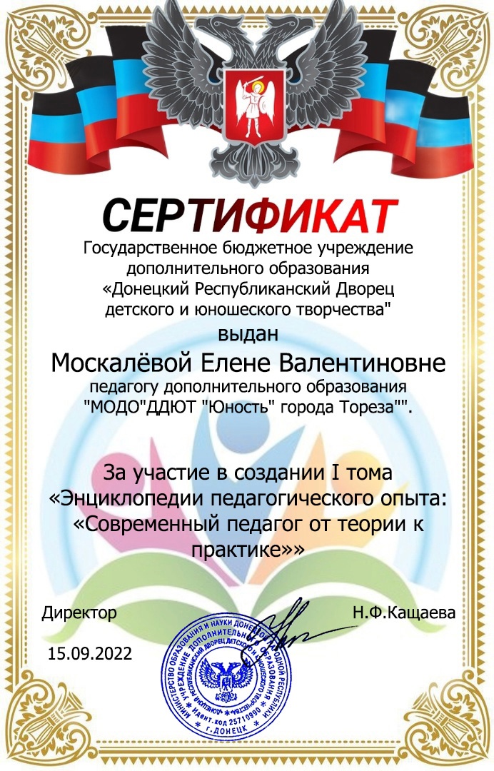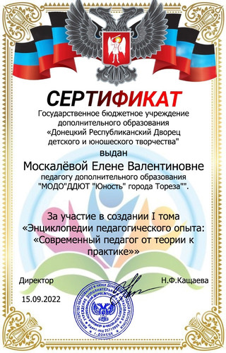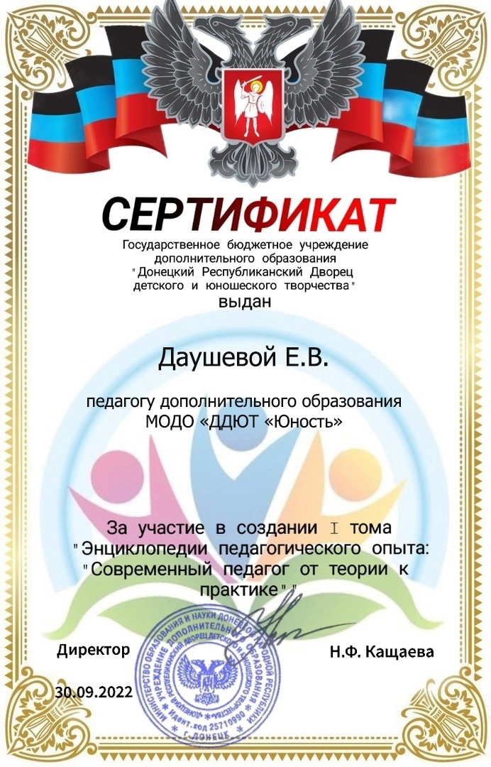 Поздравляем педагогов: Даушеву Екатерину Валерьевну и Москалеву Елену Валентиновну с получением сертификатов от Республиканского Дворца творчества за участие в создании I тома «Энциклопедии педагогического опыта: «Современный педагог от теории к практике»». | |
