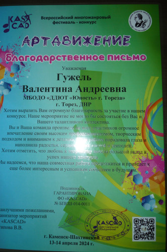 13 мая солисты народного ансамбля эстрадной песни «Тоника» (педагог Гужель В.А.) приняли участие во Всероссийском многожанровом фестивале-конкурсе «АртДвижение» (г. Каменск-Шахтинский). Наши талантливые юные артисты привезли 2 Гран-при, 6 первых мест, 1 второе и 1 третье место! Гран-при – Тимченко Маргарита, Гран-при – ансамбль (Зайцева Маргарита, Селионова Алина, Рымар Мария, Шаргородская Полина, Антошенко Вероника). 6 первых мест – Зайцева Маргарита (народный и эстрадный вокал), Рымар Мария (за исполнение 2 композиций, эстрадный вокал), Гавриков Александр (эстрадный вокал), Селионова Алина (патриотическая песня). 2-е место – Гавриков Александр (эстрадный вокал). 3-е место – Селионова Алина (эстрадный вокал). Зайцева Маргарита награждена специальный приз за глубокое и проникновенное исполнение. Коллектив получил сертификат на 1000 рублей. Педагог Гужель В.А. награждена благодарственным письмом. Все участники получили массу эмоций, колоссальный опыт и прекрасное настроение. Поздравляем с победой участников, руководителя и родителей! Ваши талант и старания были отмечены заслуженной победой. Удачи в дальнейших выступлениях и пусть каждая победа будет только нарастающим успехом! Молодцы! | |