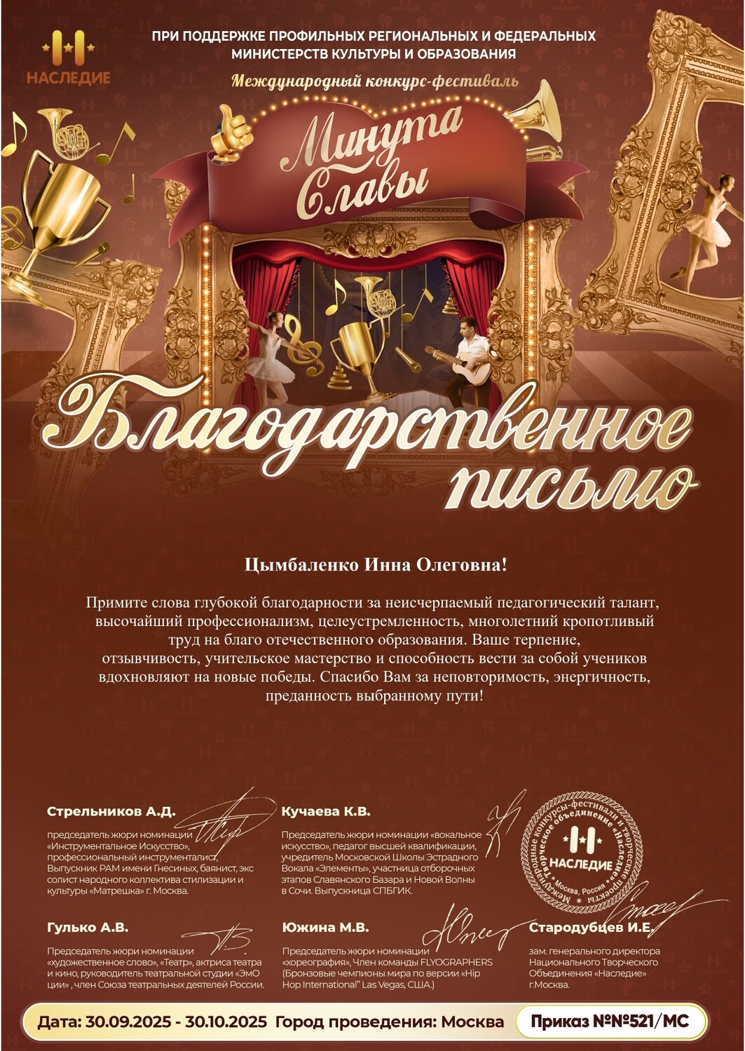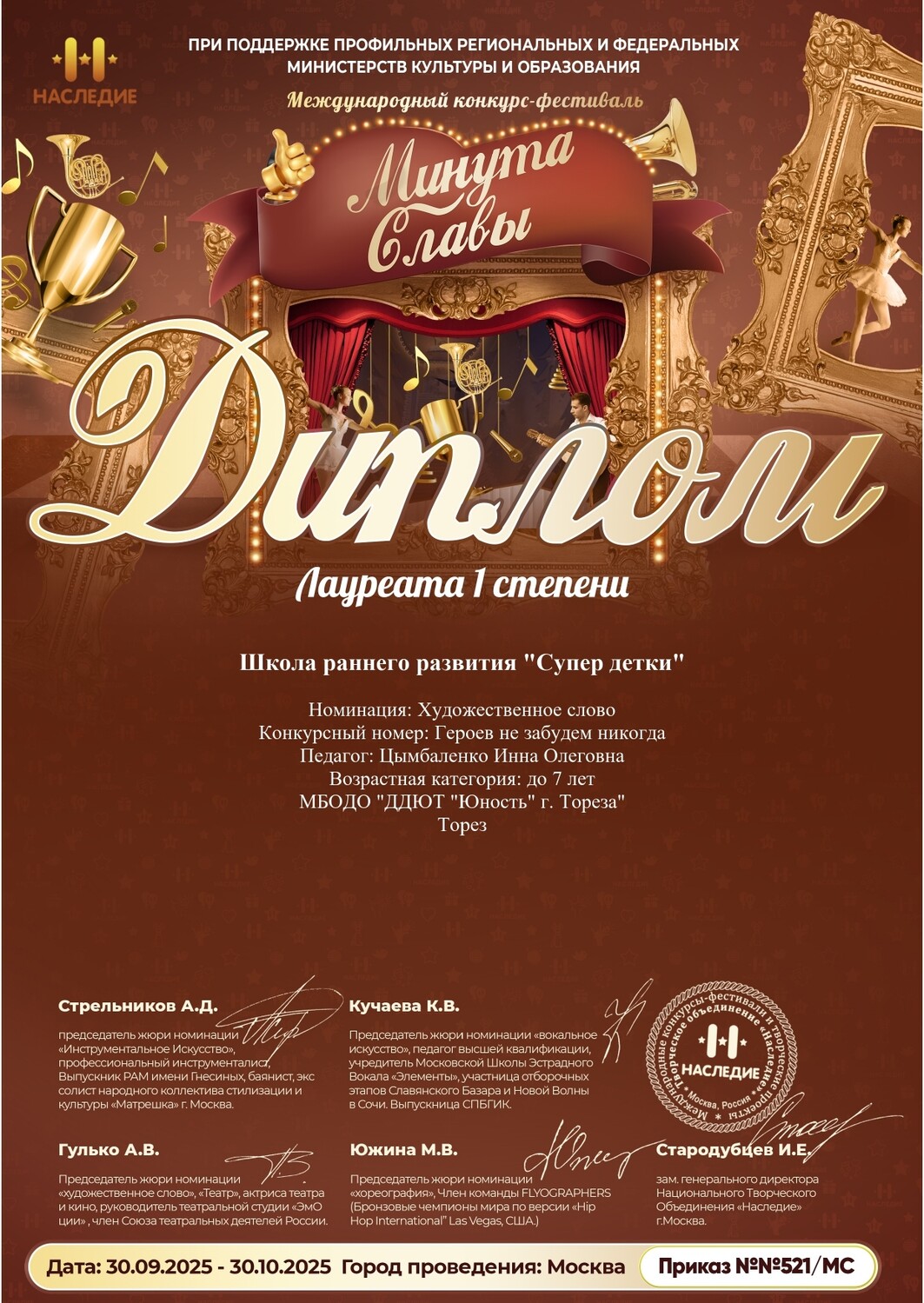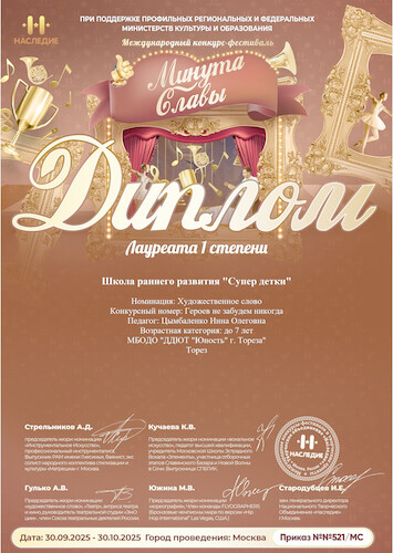 Поздравляем школу раннего развития "Супер детки" с победой в Международном конкурсе-фестивале "Минута славы" (г. Москва). Педагог Цымбаленко И.О. награждена благодарственным письмом.
