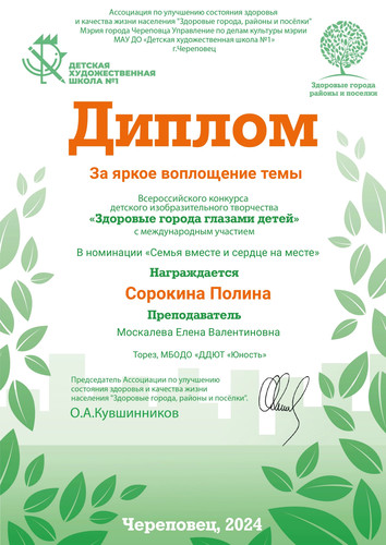 Сорокина Полина, обучающаяся образцового художественного коллектива «Школа красоты» (педагог Москалева Е.В.), приняла участие во Всероссийском конкурсе детского изобразительного творчества «Здоровые города глазами детей» с международным участием (г. Череповец) и награждена дипломом «За яркое воплощение темы» (номинация «Семья вместе и сердце на месте»). Поздравляем! | |