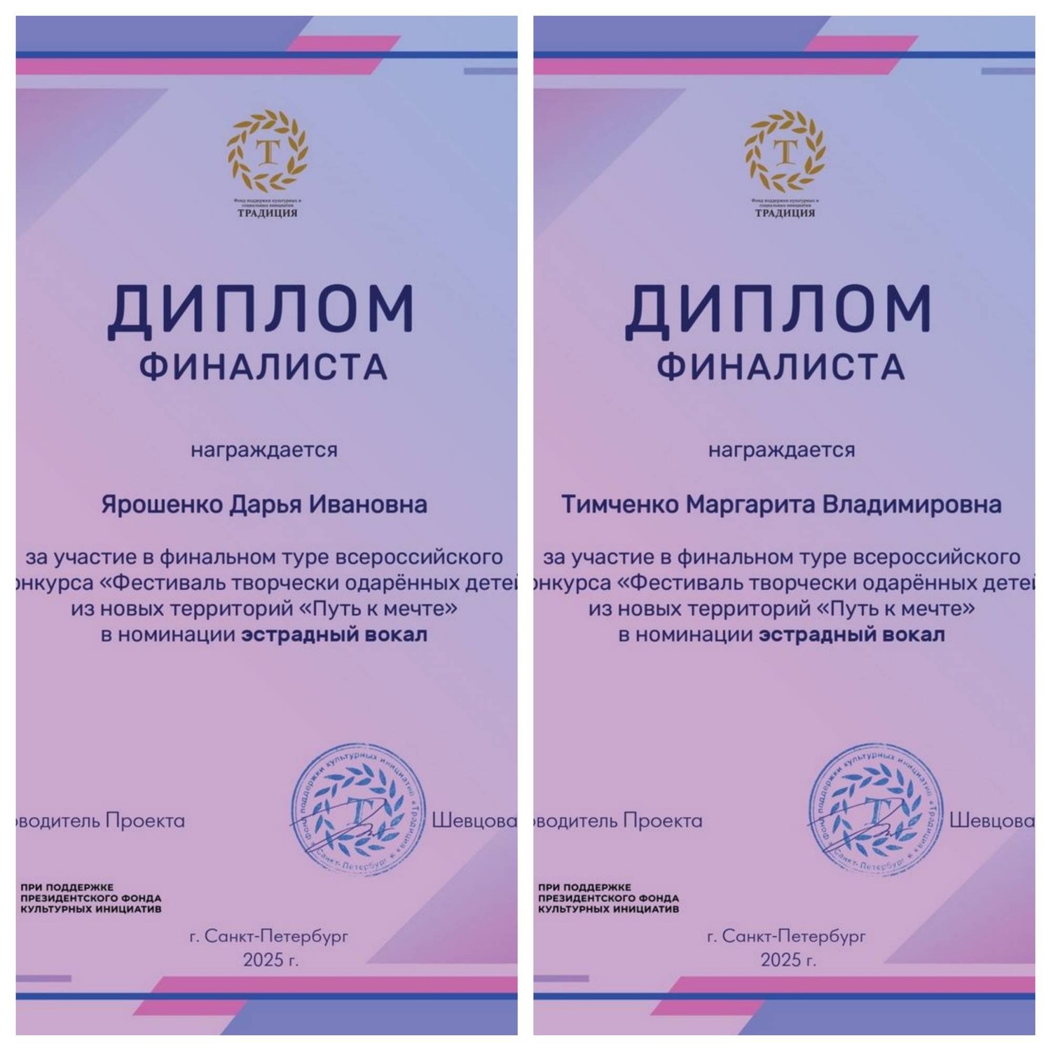Солисты народного ансамбля эстрадной песни «Тоника» (педагог Гужель В.А.) Тимченко Маргарита и Ярошенко Дарья стали финалистами всероссийского конкурса «Фестиваль творчески одарённых детей из новых территорий «Путь к мечте» в номинации эстрадный вокал. Поздравляем!