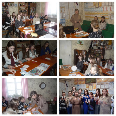 23 марта в народном художественном коллективе «Рукодельница» (педагог Дегтярева Е.Н.) состоялся открытый урок «Путешествие в прекрасный мир славянской народной куклы». Приобщение детей к русской народной культуре является сегодня актуальной темой. Детям обязательно нужно знать историю своего народа, его традиции, культуру, промыслы, чтобы чувствовать себя его частью, ощущать гордость за свою страну. Сохраняя и передавая следующим поколениям культурные и нравственные ценности русского народа, нужно возвращать в нашу жизнь и жизнь наших детей самодельную куклу. Бесценность работы с народной куклой понять не трудно. В играх с куклами дети учатся общаться, фантазировать, творить, проявлять милосердие, тренируют память. Традиционные народные куклы служили оберегами, являлись непременными атрибутами праздничных обрядов. Некоторые куклы изготавливались для совершения обряда, а другие бережно хранились в сундуках, и передавались из поколения в поколение. В стародавние времена кукла сопровождала человека на протяжении всей жизни: встречала новорождённого в колыбели, помогала в тяжёлые времена, принимала на себя болезни, оберегала от злых сил. Игры с куклами поощрялись взрослыми, ведь с их помощью ребёнок познавал себя и мир, учился вести хозяйство, обретал образ семьи. «Кто в куклы не играет, тот счастья не знает», гласит народная поговорка. Обучающиеся не только познакомились с видами народной куклы, отлично справились с вопросами викторины, но ещё и самостоятельно подготовили очень интересную историческую информацию. Педагог очень подробно рассказала этапы изготовления куклы «Неразлучницы» и работа закипела. Обучающиеся старались всё делать аккуратно и эстетично, внимательно слушали объяснения руководителя. Куклы у всех получились замечательные и участницы открытого урока поблагодарили Дегтяреву Е.Н. за прекрасно подготовленное занятие | |