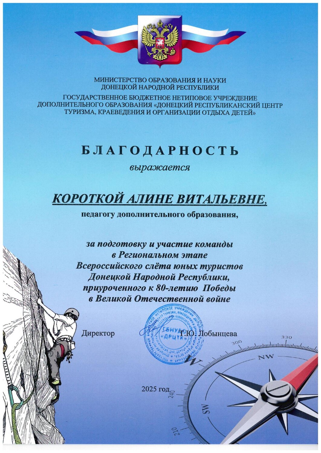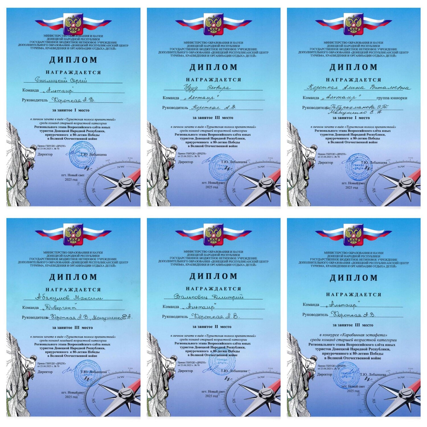 Донецкий Республиканский Центр туризма, краеведения и организации отдыха детей провел Республиканский туристский слет обучающихся. С 4 по 7 июля 2025 года в пгт. Новый Свет, на берегу живописного Старобешевского водохранилища, Донецкий Республиканский Центр туризма, краеведения и организации отдыха детей провел Республиканский туристский слет обучающихся, приуроченный к 80-летию Победы в Великой Отечественной войне, в котором приняли участие спортсмены ТО «Пешеходный туризм» (педагог Короткая АВ.). Впервые слет прошел, как региональный этап Всероссийского слёта юных туристов. В мероприятии приняли участие 11 команд из Донецка, Горловки, Тореза, Амвросиевки, Комсомольского, пгт. Новый Свет с общим количеством участников около 100 человек. В программу Слета входили спортивное ориентирование и пешие дистанции, соревнование «Контрольно-туристский маршрут» и конкурсная программа. Перед началом Слета для юных участников была организована тренировка на полосе препятствий. Завершился Слет песнями у костра и пенной вечеринкой. Наши итоги: 5 первых мест, 7 вторых и 10 третьих! Команда «Альтаир»: 1 места – конкурс «Узлы», «Туристская полоса препятствий» (старшая возрастная категория); Короткая Алина. Гнилицкий Сергей. 2 места – «Контрольно-туристский маршрут» (младшая категория), конкурс «Краеведение», «Контрольно-туристский маршрут» (старшая категория), общекомандный зачёт» (младшая и старшая возрастная категория). Вальковец Дмитрий. 3 места – «Туристская полоса препятствий», «Узлы», «Конкурсная программа», «Карабинная эстафета (младшая возрастная категория); «Карабинная эстафета» (старшая категория), Удуд Эльвира.