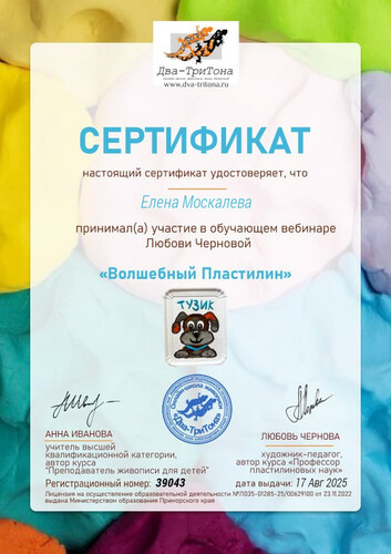 Педагог народного художественного коллектива «Живопись и графика» Даушева Е.В. и педагог образцового художественного коллектива "Школа красоты" Москалева Е.В. подучили сертификаты за участив в обучающем вебинаре «Волшебный Пластилин» (платформа «Два-ТриТона»).
