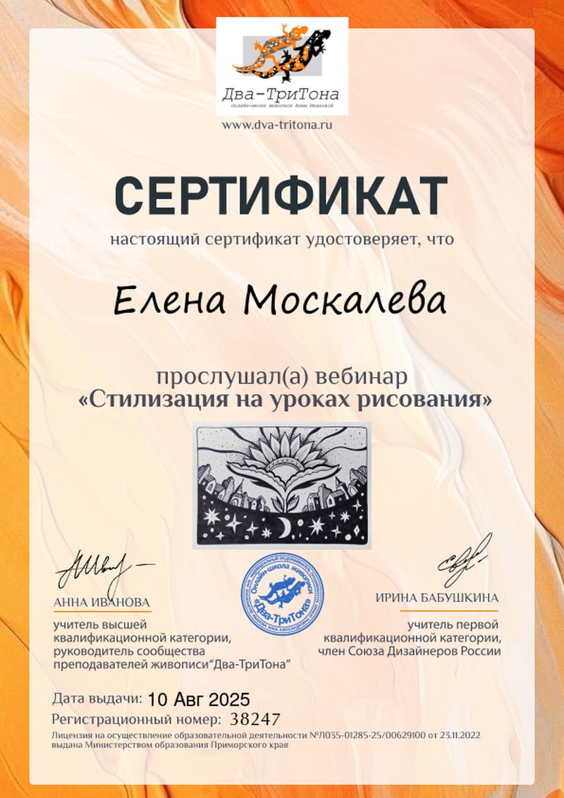 Педагог образцового художественного коллектива «Школа красоты» Москалева Е.В. подучила сертификат за участив в вебинаре «Стилизация на уроках рисования» (платформа «Два-ТриТона»).