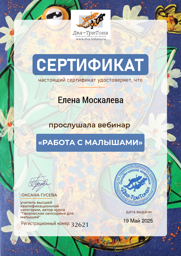 Педагог Дворца творчества Москалева Е.В. получила сертификат за участие в вебинаре «Работа с малышами». | |
