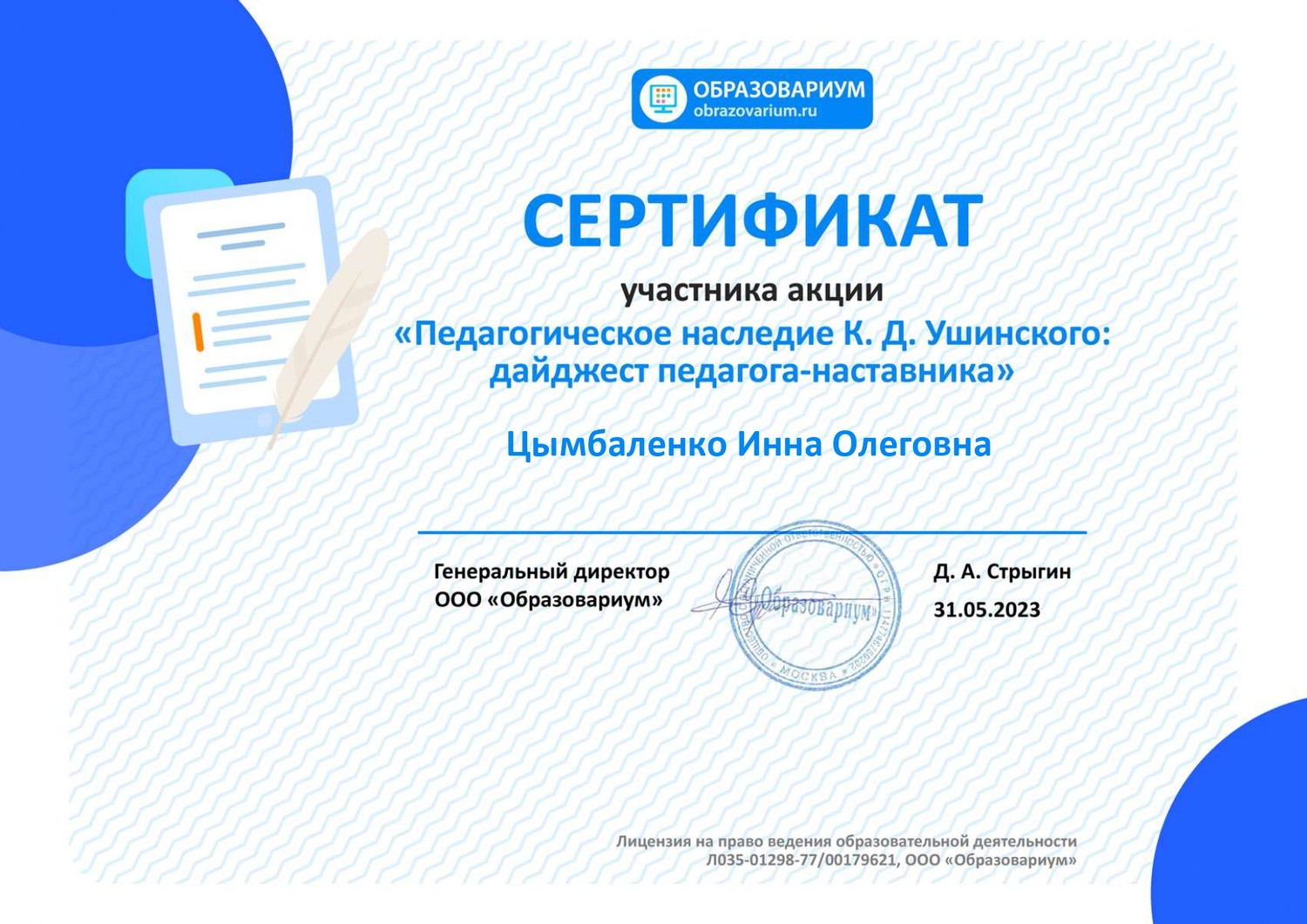 Педагог МБОДО «ДДЮТ «Юность» Цымбаленко И.О. награждена сертификатом участника акции «Педагогическое наследие К.Д.Ушинского: дайджест педагога-наставника». Акция проходила на платформе «Образовариум». | |