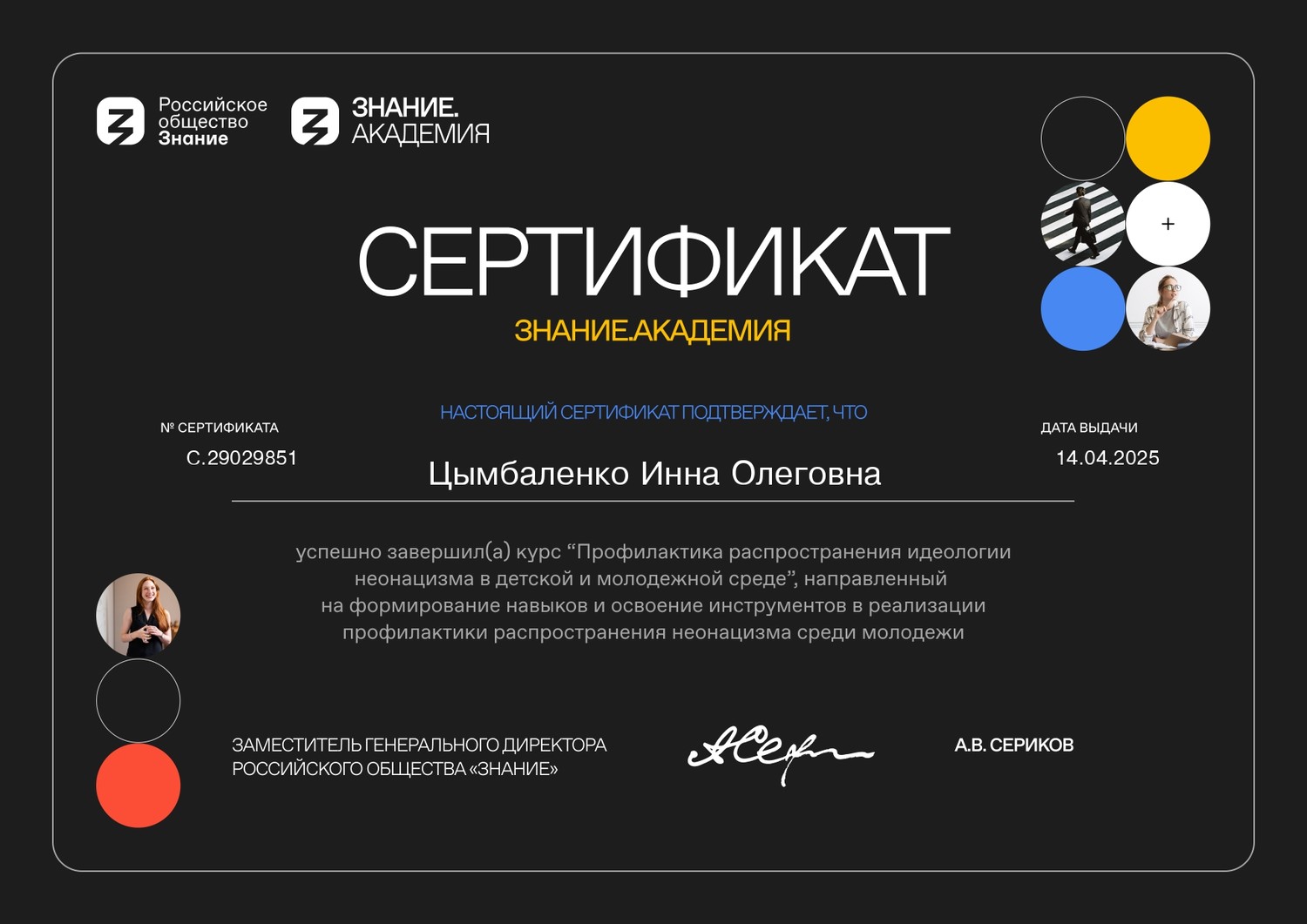 Педагог Дворца творчества успешно прошла курс «Профилактика распространения идеологии неонацизма в детской и молодёжной среде», направленный на формирование навыков и освоение инструментов в реализации профилактики распространения неонацизма среди молодёжи от Российского общества «Знание». | |
