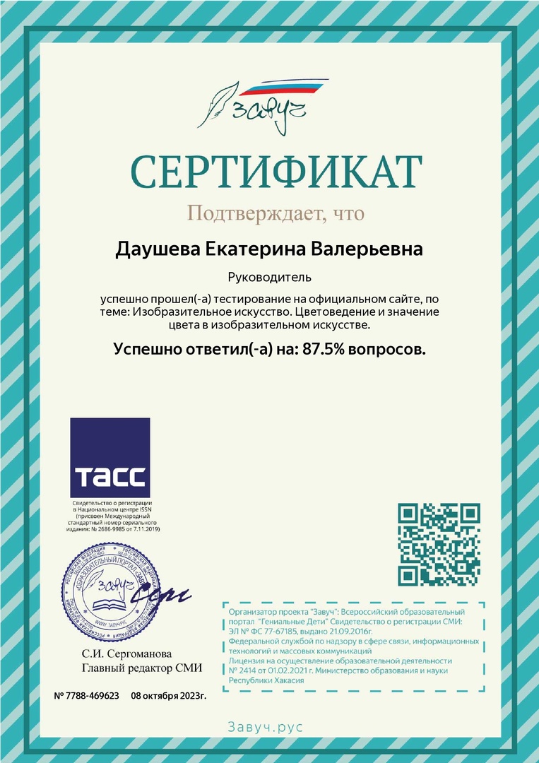 Педагог МБОДО «ДДЮТ «Юность» Даушева Е.В. получила сертификат за прохождение теста «Изобразительное искусство. Цветоведение и значение цвета в изобразительном искусстве» и успешно ответила на 87,5% вопросов. Организатор тестирования – Всероссийский образовательный портал «Завуч» (Хакасия). Поздравляем!