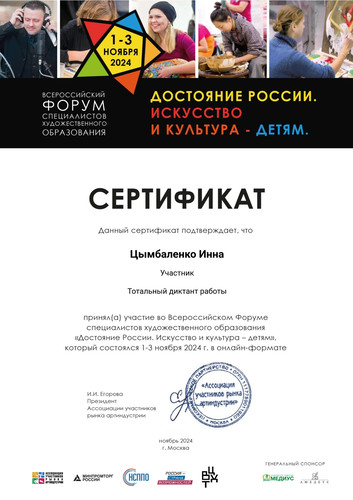 Педагог Дворца творчества Цымбаленко И.О. получила сертификат за участие во Всероссийском форуме специалистов художественного образования «Достояние России. Искусство и культура – детям», который состоялся 1-3 ноября 2024 года в онлайн-формате (г. Москва). | |