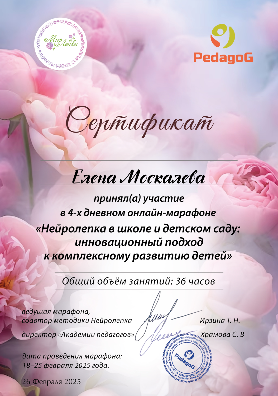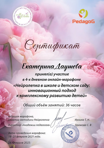 Педагоги Дворца творчества Даушева Е.В. и Соскалева Е.В. приняли участие в 4х-дневном онлайн-марафоне «Нейролепка в школе и детском саду: инновационный подход к комплексному развитию детей». | |