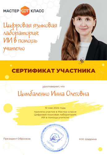 Педагог МБОДО «ДДЮТ «Юность» Цымбаленко И.О. 10.05.2024 приняла участие в мастер-классе «Цифровая языковая лаборатория: ИИ в помощь учителю» от Обрсоюха (г. Москва). | |