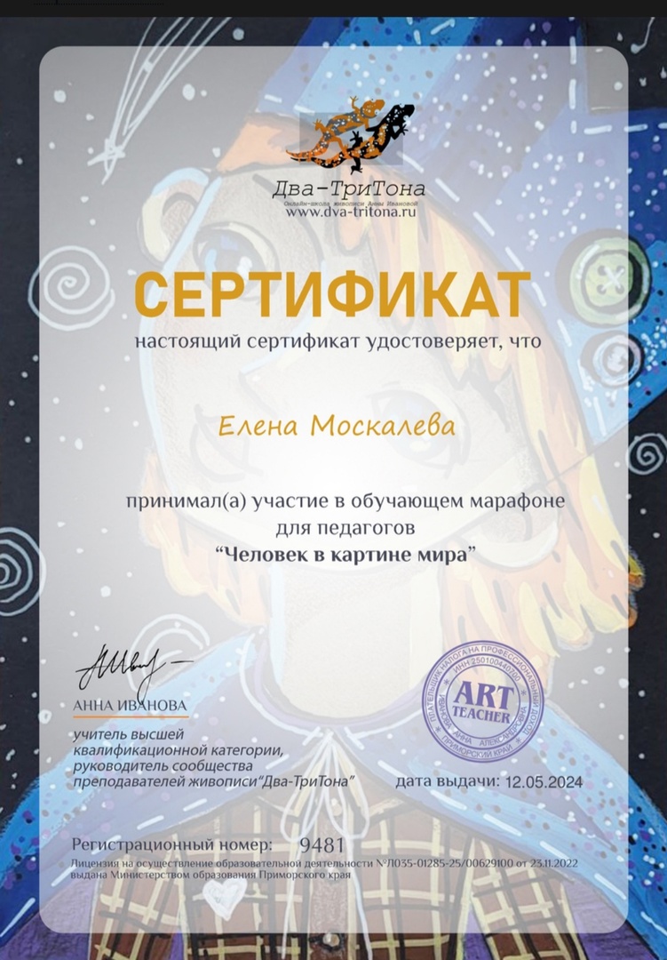 Педагог МБОДО «ДДЮТ «Юность» Москалева Е.В. награждена сертификатом за участие в обучающем марафоне для педагогов «Человек в картине мира» от платформы «Два-ТриТона». | |