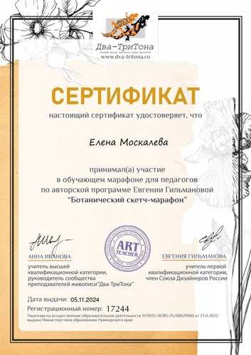 Педагоги Дворца творчества Даушева Е.В. и Москалева Е.В.приняли участие в обучающем марафоне для педагогов по авторской программе Евгении Гильмановой «Ботанический скетч-марафон» (Приморский край). | |