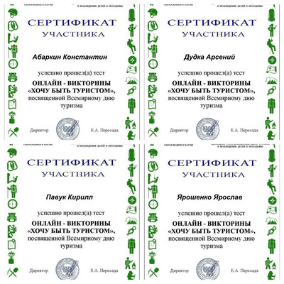 Обучающиеся клуба «Пешеходный туризм» (педагог Габдрахманова Э.Т.) МБОДО «ДДЮТ «Юность» приняли участие в онлайн-викторине «Хочу быть туристом», посвящённой Всемирному дню туризма. Сертификаты получили – Ярошенко Ярослав, Дудка Арсений, Павук Кирилл и Абаркин Константин. Молодцы! Так держать!