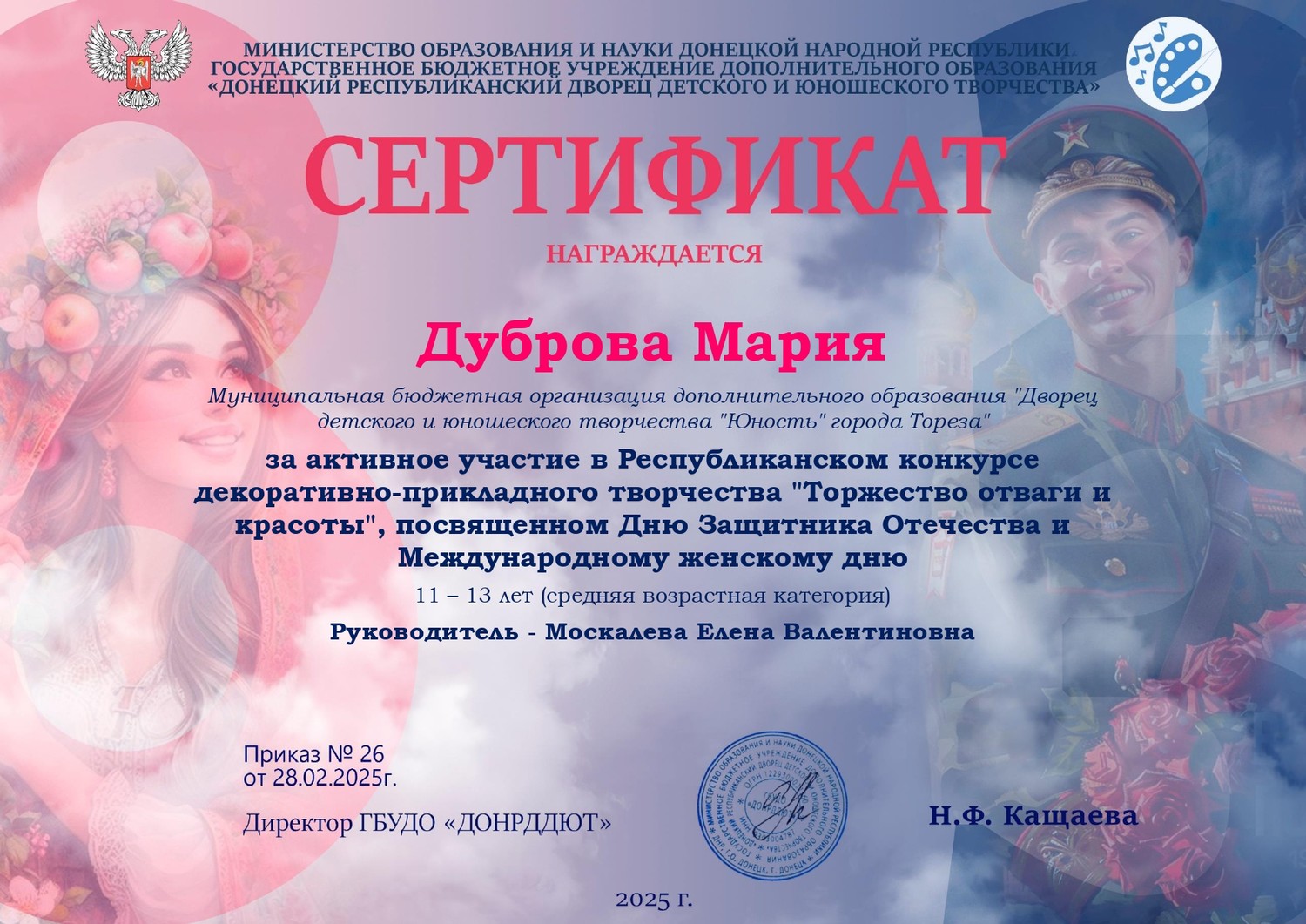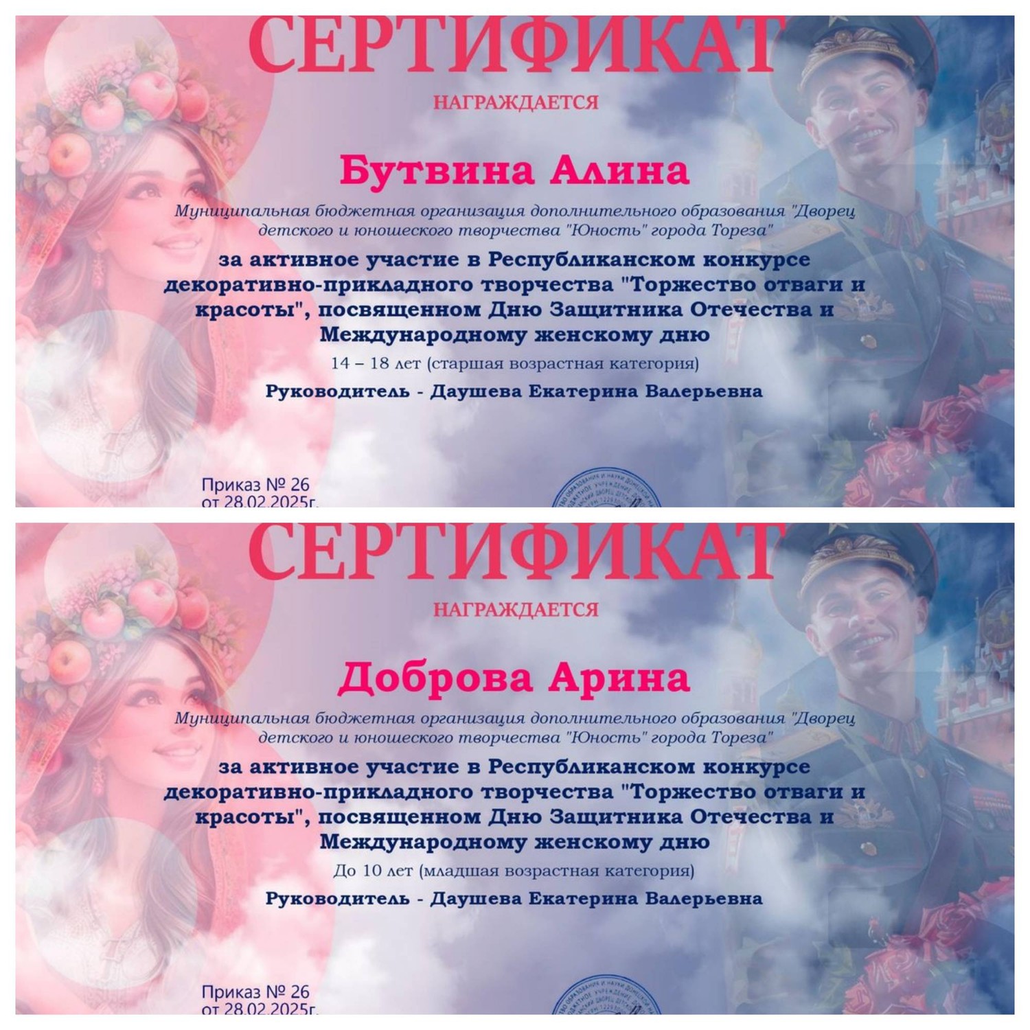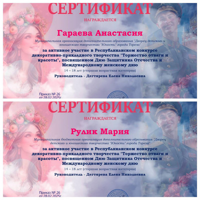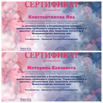 Обучающиеся творческих объединений награждены сертификатами за активное участие в Республиканском конкурсе декоративно-прикладного творчества «Торжество отваги и красоты», посвящённом Дню защитника Отечества и Международному женскому дню. Народный художественный коллектив «Живопись и графика» (педагог Даушева Е.В.) – награждены Бутвина Алина и Доброва Арина; Народный художественный коллектив «Волшебная ниточка» (педагог Привалова Т.А.) – награждены Моторина Елизавета и Константинова Яна; Народный художественный коллектив «Рукодельница» (педагог Дегтярева Е.Н.) – награждены Гараева Анастасия и Рулик Мария; Образцовый художественный коллектив «Школа красоты» (педагог Москалева Е.В.) – награждена Дуброва Мария. Поздравляем с заслуженной наградой! | |
