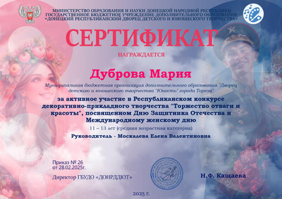 Главная » 2025 Май 5 » Сертификаты за участие в конкурсе «Торжество отваги и красоты»