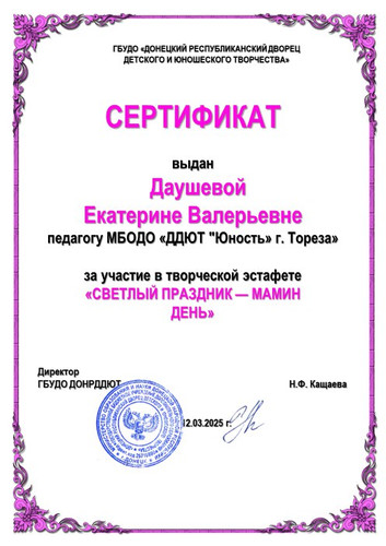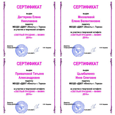 Педагоги Дворца творчества Дегтярева Е.Н., Москалева Е.В., Привалова Т.А., Даушева Е.В. и Цымбаленко И.О. награждены сертификатами от Республиканского Дворца за участие в творческой эстафете «Светлый праздник – мамин день». | |