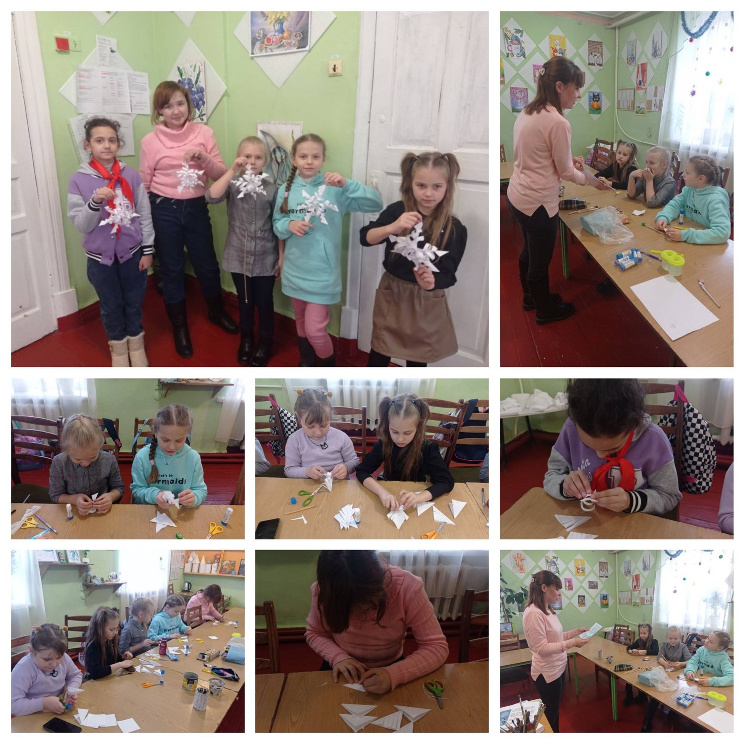 22 декабря в народном художественном коллективе «Живопись и графика» (педагог Даушева Е.В.) была проведена «Мастерская Деда Мороза» по изготовлению снежинок. Цель: способствовать развитию творческого потенциала детей при изготовлении новогодней снежинки различных форм; изучить технологическую последовательность и трудовые приемы выполнения изделия из цветной бумаги; расширить кругозор; воспитывать самостоятельность, аккуратность, бережливость, ответственность за выполняемую работу. Давайте вспомним, какие бывают снежинки при разной погоде. В тихую морозную погоду – на землю падают красивые резные снежинки. В ветряную морозную погоду у них обламываются лучи, и снежинки обращаются в снежную пыль. Если нет сильного мороза, падая на землю, снежинки лепятся друг к другу и образуют хлопья. А когда на улице оттепель, снежинки скатываются в плотные белые шарики, и мы говорим тогда, что с неба падает крупа. Дети с увлечением выполняли работу и у всех получились нарядные и красивые снежинки.