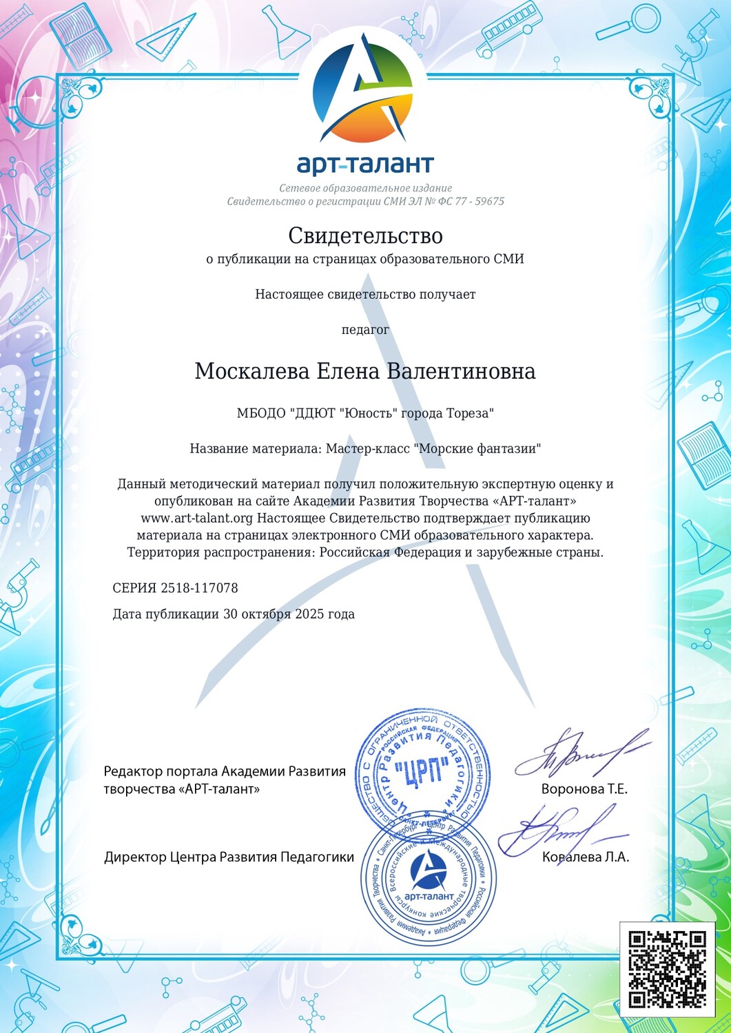 Педагог Дворца творчества Москалева Е.В. получила свидетельство о публикации на страницах образовательного СМИ за материал «Морские фантазии» (платформа Арт-талант). | |