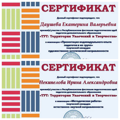 С 08 ноября по 27 декабря ГБОУ ДПО «ДОНРИРО» был проведён фестиваль педагогических идей педагогов дополнительного образования «ТУТ-2022», в котором приняли участие педагоги МБОДО «ДДЮТ «Юность». «ТУТ: Территория Увлечений и Творчества» – это мероприятие, направленное на обобщение педагогического опыта и представление педагогических идей, популяризацию результатов творческой профессиональной деятельности работников системы дополнительного образования детей. Фестиваль призван объединить и поддержать всех работников системы дополнительного образования детей. Мероприятия, проводимые в рамках Фестиваля, – это форма повышения квалификации различных субъектов системы дополнительного образования детей, что способствует формированию кадрового потенциала республиканской системы дополнительного образования детей. Целью Фестиваля является выявление и популяризация перспективного опыта педагогов дополнительного образования по эффективной педагогической, управленческой деятельности и внедрению новых идей и методических находок по совершенствованию системы дополнительного образования детей в Донецкой Народной Республике. Задачи Фестиваля: содействовать формированию и повышению позитивного социального статуса системы дополнительного образования детей в целом, её отдельных направлений, учреждений дополнительного образования в частности и профессионального имиджа работников системы дополнительного образования детей; выявить и представить педагогическому сообществу лучшие образцы педагогических практик в системе дополнительного образования детей; создать условия для самовыражения творческой профессиональной индивидуальности, реализации личностного потенциала педагогов дополнительного образования; повысить уровень профессиональной компетентности педагогических, руководящих кадров системы дополнительного образования; стимулировать профессиональное творчество педагогов дополнительного образования. Педагоги Некипелова Ирина Александровна (номинация «Методическая работа», творческая площадка естественно-научной направленности) и Даушева Екатерина Валерьевна (номинация «Презентация индивидуального опыта работы педагогов и их групп», творческая площадка художественно-эстетической направленности) награждены сертификатами за участие в фестивале. Поздравляем! | |