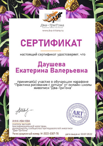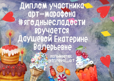 Наши педагоги вовремя отпуска не только активно отдыхают, но и занимаются самообразованием. Так, руководитель народного художественного коллектива «Живопись и графика», Даушева Екатерина Валерьевна и руководитель образцового художественного коллектива "Школа красоты", Москалева Елена Валентиновна получили дипломы участников арт-марафона «Ягодные сладости», Даушева Е.В. получила сертификат за участие в обучающем марафоне «Техника рисования с детьми» от онлайн-школы живописи «Два-Три Тона», Награждена грамотой за участие в фото-флешмобе «Папа с дочкой на прогулке». Поздравляем и желаем творческих успехов! | |