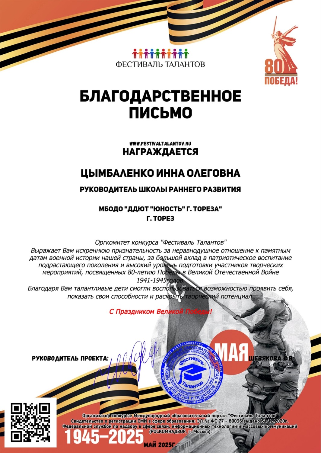 Обучающиеся школ раннего развития «Город друзей» и «Супер детки» приняли участие во Всероссийском конкурсе, посвященного 80-летию Победы в ВОВ «80 лет под знаменем Победы» и стали лауреатами 1 степени! Педагог Цымбаленко И.О. награждена благодарственным письмом. Молодцы! Мы вами гордимся! | |