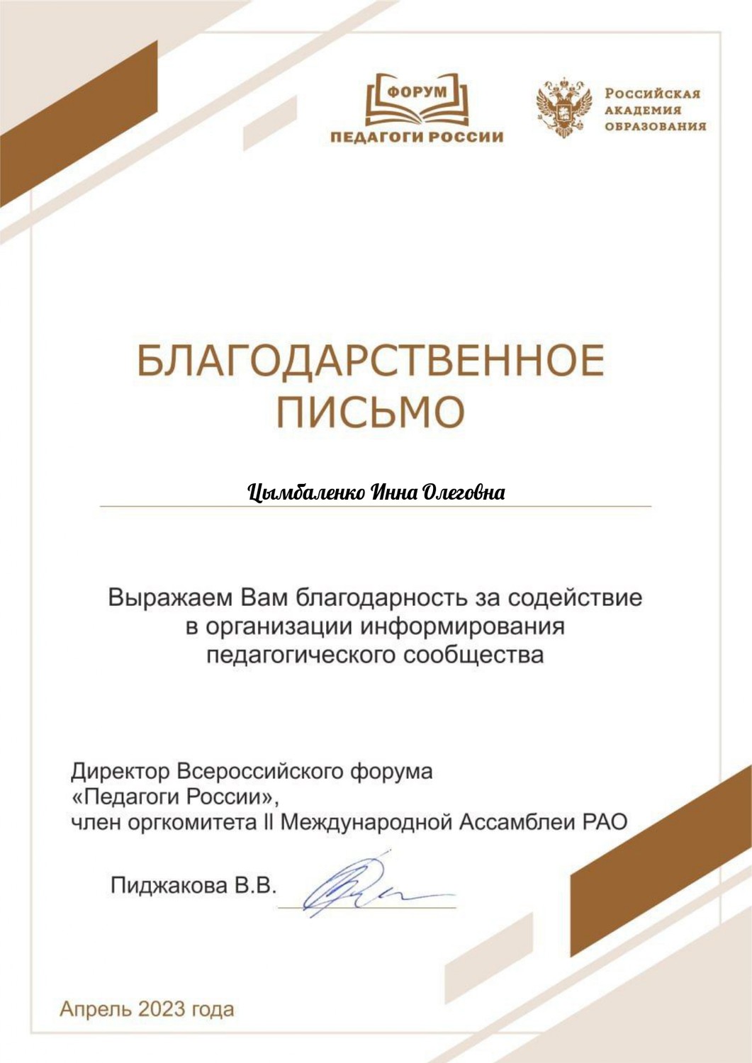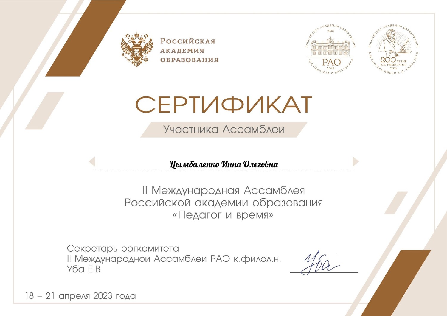 18-21 апреля педагог МБОДО «ДДЮТ «Юность» Цымбаленко И.О. приняла участие во II Международной ассамблее Российской академии образования «Педагог и время». Педагог награждена сертификатом и благодарностью за содействие в организации информирования педагогического сообщества.