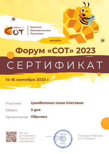 14-16 октября в Москве состоялся форум СОТ, в котором дистанционно приняла участие педагог МБОДО «ДДЮТ «Юность» Цымбаленко И.О. Всероссийский Форум «Сквозные образовательные траектории» имеет свою историю. Впервые он прошел в октябре 2021 года в Ялте, а годом позже – в подмосковном городе Серпухов. Форум объединил более 30 тысяч увлеченных своим делом педагогов со всей страны. На офлайн- и онлайн-площадках встретились эксперты, работники образования, представители органов власти, некоммерческих организаций. Они делились опытом, соревновались в интеллектуальных состязаниях. В программе форума - Мастерские победителей конкурса «СОТ» 2022, Гайд-парк, Интеллектуальные состязания, Пресс-конференция, Открытая лекция «Игровая и соревновательная мотивация в онлайн-обучении детей», Интерактивная сессия «1Т клуб, как средство достижения целей проекта».