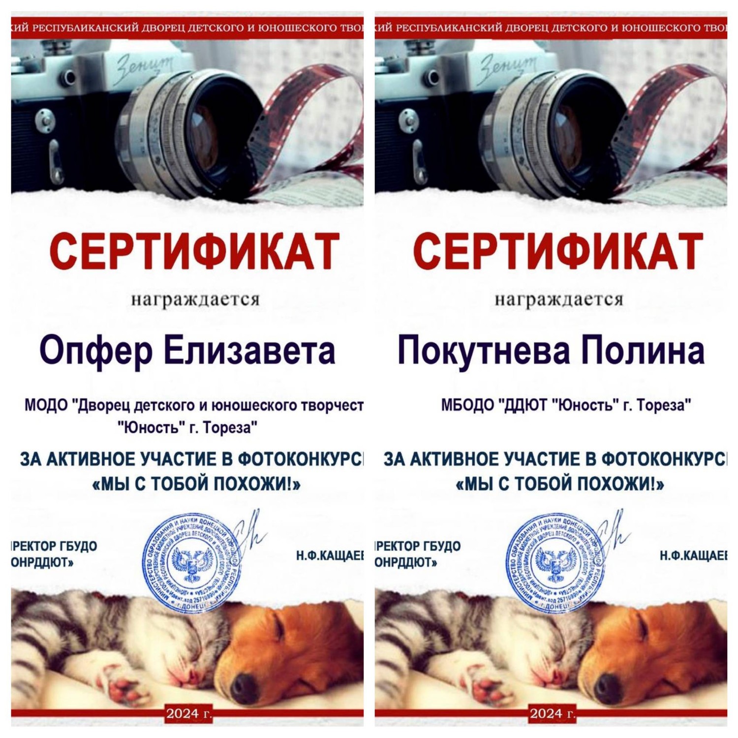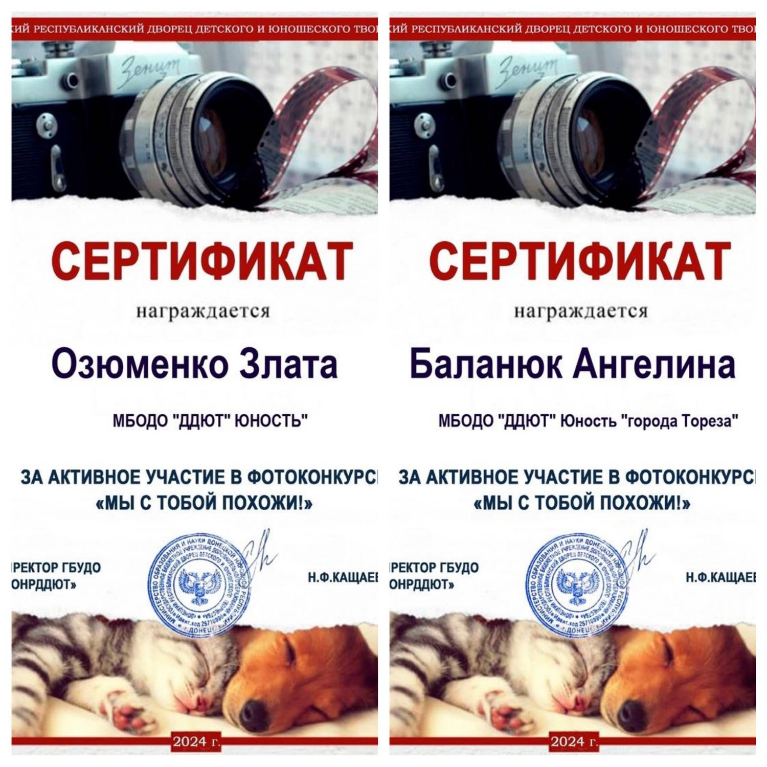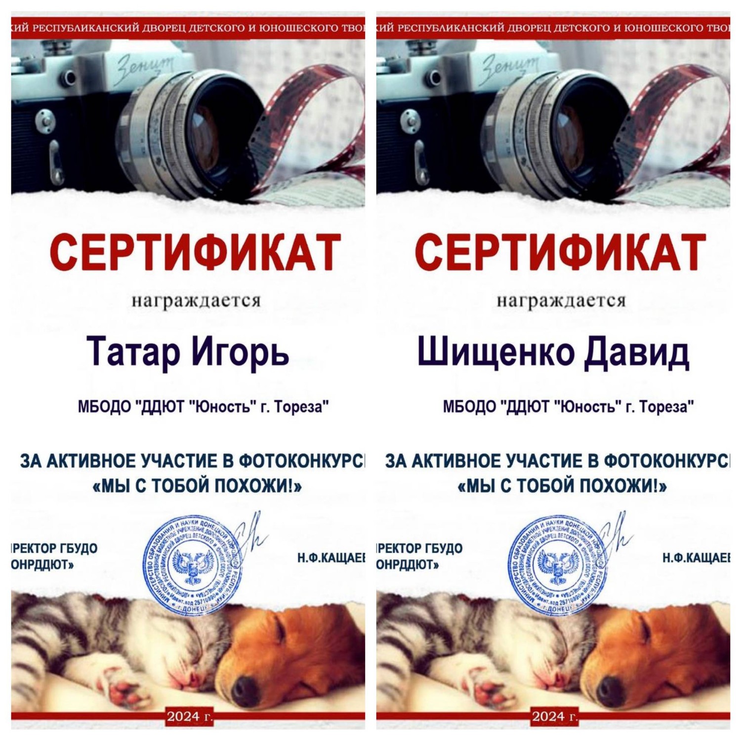 С 19 сентября по 04 октября 2024 года Донецким Республиканским Дворцом детского и юношеского творчества был проведен фотоконкурс "Мы с тобой похожи!", приуроченный ко Всемирному дню животных. В творческом мероприятии приняли участие обучающиеся школ раннего развития «Город друзей» и «Супер детки» (педагог Цымбаленко И.О.) и народного художественного коллектива «Живопись и графика» (педагог Даушева Е.В.). Благодаря конкурсу юные фотографы показали насколько интересна и увлекательна жизнь животных, и как много общего между людьми и их питомцами. Все дети награждены сертификатами за активное участие в фотоконкурсе! Будьте верны своим питомцам, любите их, и они обязательно ответят вам взаимностью! | |