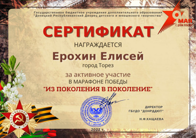 Поздравляем Ерохину Есению и Ерохина Елисея, обучающихся народного ансамбля современного танца «Баттерфляй», с получением сертификатов за активное участие в марафоне чтецов «Из поколения в поколение», проводимым ГБДОУ «ДОНРДДЮТ». | |