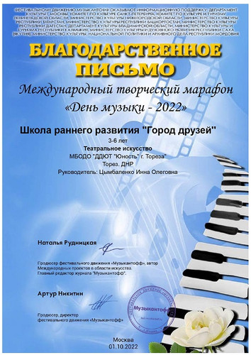 Народный ансамбль эстрадной песни «Тоника» (педагог Гужель В.А.) и школа раннего развития «Город друзей» (педагог Цымбаленко И.О.) приняли участие в Международном творческом марафоне «День музыки-2022» от фестивального движения Музыкантофф (г. Москва). За участие в марафоне коллективы награждены благодарственными письмами. Поздравляем! | |