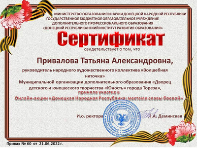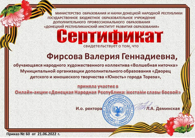 Диденко Назар, обучающийся образцового художественного коллектива «Школа красоты» и руководитель коллектива Москалева Е.В., Фирсова Валерия, обучающаяся народного художественного коллектива «Волшебная ниточка» и руководитель коллектива Привалова Т.А. награждены сертификатами от ГБОУ дополнительного профессионального образования «Донецкий Республиканский институт образования» за участие в онлайн-акции «Донецкая Народная Республика: местами славы боевой». Поздравляем! | |