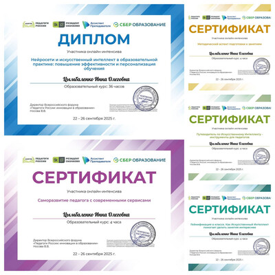 Педагог Дворца творчества Цымбаленко И.О. получила диплом участника онлайн-интенсива на платформе «Педагоги России» «Нейросети и искусственный интеллект в образовательной практике: повышение эффективности и персонализация обучения». | |