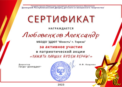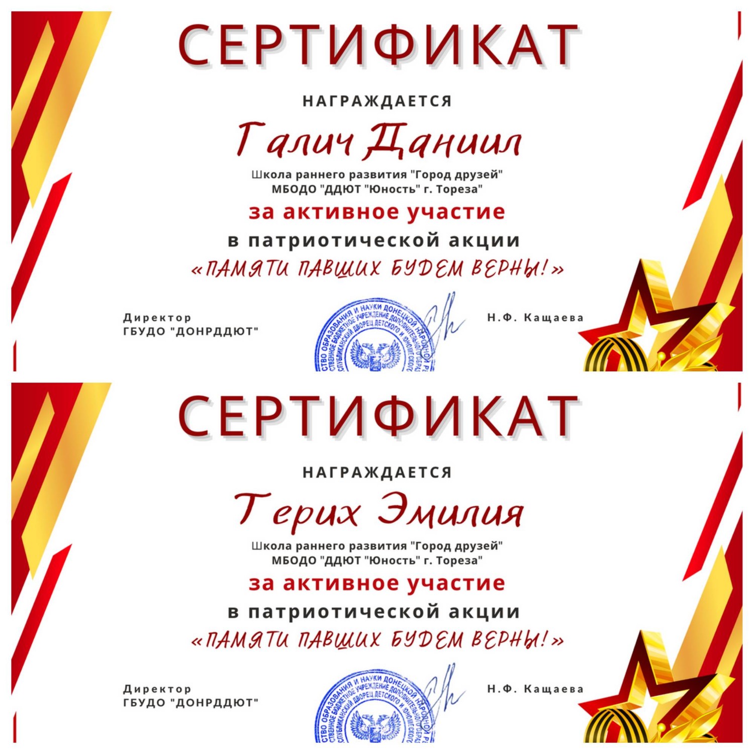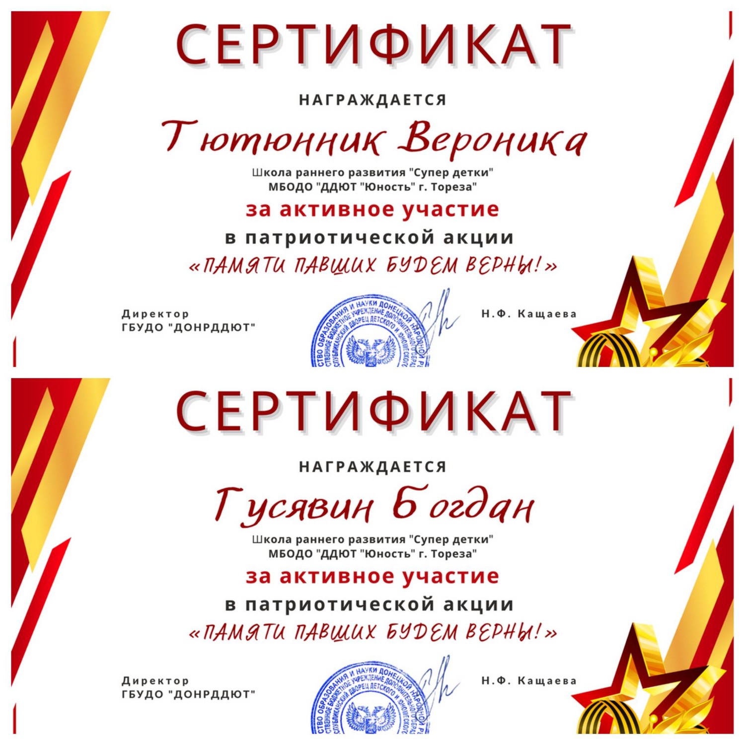 Обучающиеся МБОДО «ДДЮТ «Юность» приняли участие в патриотической акции «Памяти павших будем верны» от ГБУДО «ДонРДДЮТ». В акции приняли участие: Любовенков Александр (образцовый художественный коллектив «Школа красоты»), Тютюнник Вероника и Гусявин Богдан (школа раннего развития «Супер детки»), Галич Даниил и Терих Эмилия (школа раннего развития «Город друзей»). Поздравляем!