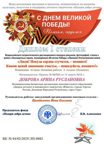 Воспитанница школы раннего развития «Город друзей» Доброва Арина приняла участие во Всероссийском патриотическом дистанционном конкурсе рисунков, фотографий и стихов о войне и бессмертных героях, посвящённого 80-летию Победы в ВОВ "Люди" Покуда сердца стучатся - помните! Какою ценою завоёвано счастье, - пожалуйста, помните!" и завоевала диплом 1-ой степени! Поздравляем! | |